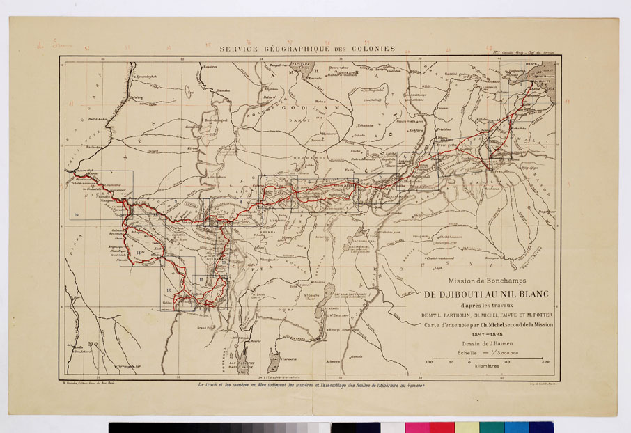 MISSION DE BONCHAMPS DE DJIBOUTI AU NIL BLANC D'APRES LES TRAVAUX DE M.RS L. BARTHOLIN, CH. MICHEL, FAIVRE ET M. POTTER. CARTE D'ENSEMBLE PAR CH. MICHEL SECOND DE LA MISSION 1897 - 1898 DESSIN DE J. HANSEN - Quadro d'unione
