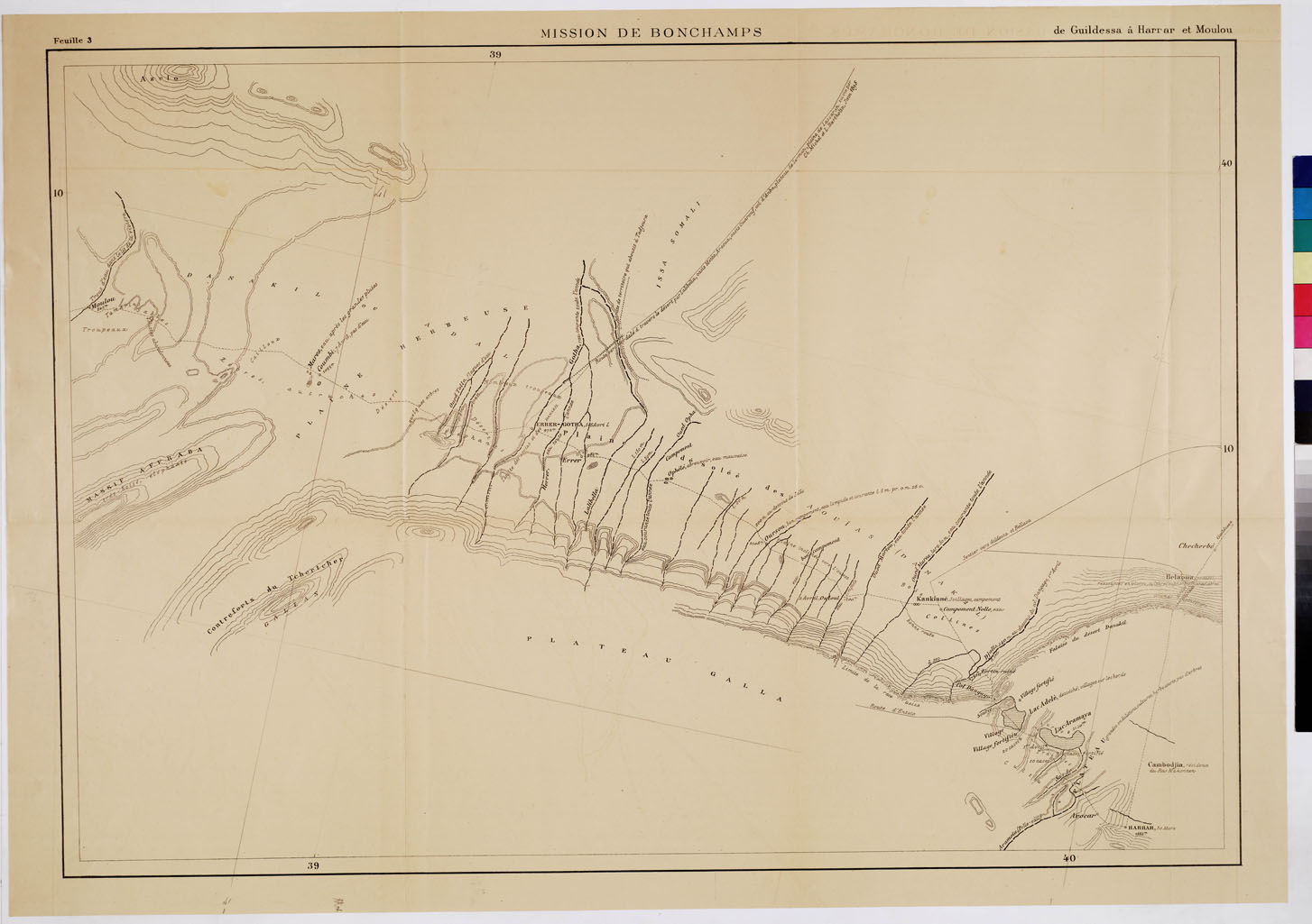 MISSION DE BONCHAMPS DE DJIBOUTI AU NIL BLANC D'APRES LES TRAVAUX DE M.RS L. BARTHOLIN, CH. MICHEL, FAIVRE ET M. POTTER. CARTE D'ENSEMBLE PAR CH. MICHEL SECOND DE LA MISSION 1897 - 1898 DESSIN DE J. HANSEN - Foglio 3 - Da Guildessa a Harrar e Moulou