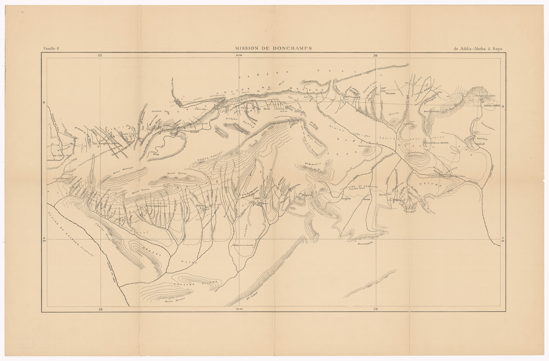 MISSION DE BONCHAMPS DE DJIBOUTI AU NIL BLANC D'APRES LES TRAVAUX DE M.RS L. BARTHOLIN, CH. MICHEL, FAIVRE ET M. POTTER. CARTE D'ENSEMBLE PAR CH. MICHEL SECOND DE LA MISSION 1897 - 1898 DESSIN DE J. HANSEN - Foglio 6 - Da Addis Abeba a Sayo