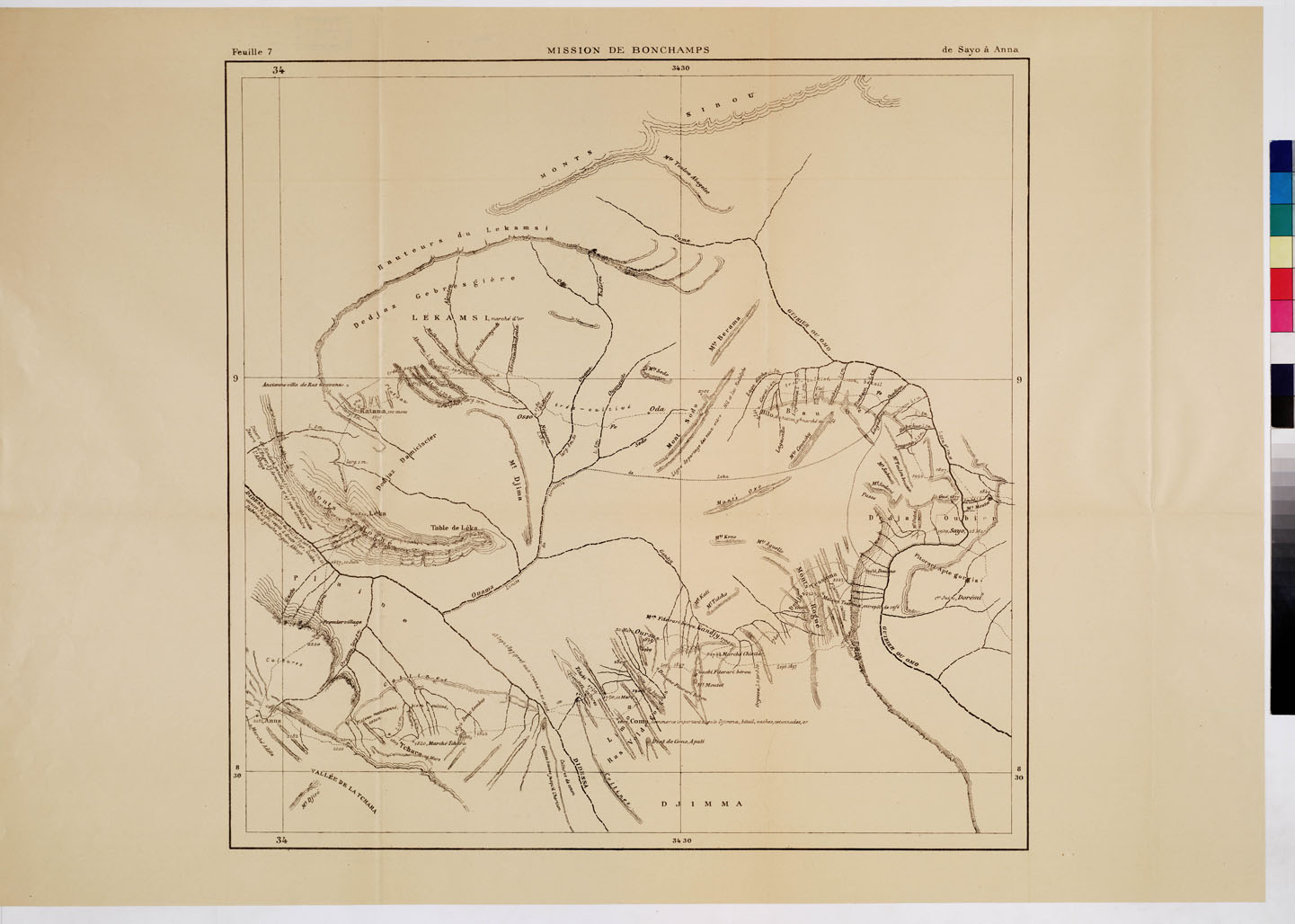 MISSION DE BONCHAMPS DE DJIBOUTI AU NIL BLANC D'APRES LES TRAVAUX DE M.RS L. BARTHOLIN, CH. MICHEL, FAIVRE ET M. POTTER. CARTE D'ENSEMBLE PAR CH. MICHEL SECOND DE LA MISSION 1897 - 1898 DESSIN DE J. HANSEN - Foglio 7 - Da Sayo a Anna