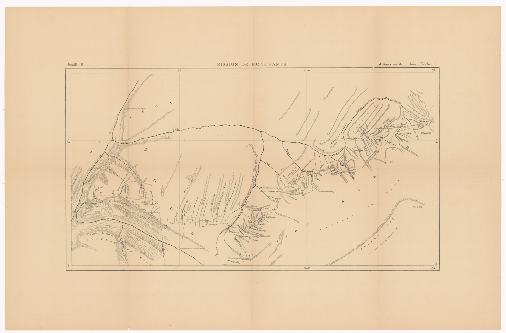 MISSION DE BONCHAMPS DE DJIBOUTI AU NIL BLANC D'APRES LES TRAVAUX DE M.RS L. BARTHOLIN, CH. MICHEL, FAIVRE ET M. POTTER. CARTE D'ENSEMBLE PAR CH. MICHEL SECOND DE LA MISSION 1897 - 1898 DESSIN DE J. HANSEN - Foglio 8 - D'Anna au Mont Henri Clochette