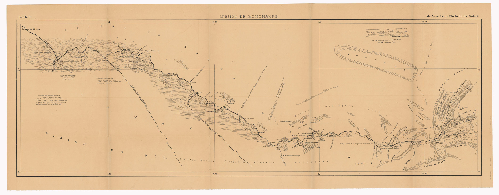 MISSION DE BONCHAMPS DE DJIBOUTI AU NIL BLANC D'APRES LES TRAVAUX DE M.RS L. BARTHOLIN, CH. MICHEL, FAIVRE ET M. POTTER. CARTE D'ENSEMBLE PAR CH. MICHEL SECOND DE LA MISSION 1897 - 1898 DESSIN DE J. HANSEN - Foglio 9 - Du Mont Henri Clochette au Sobat