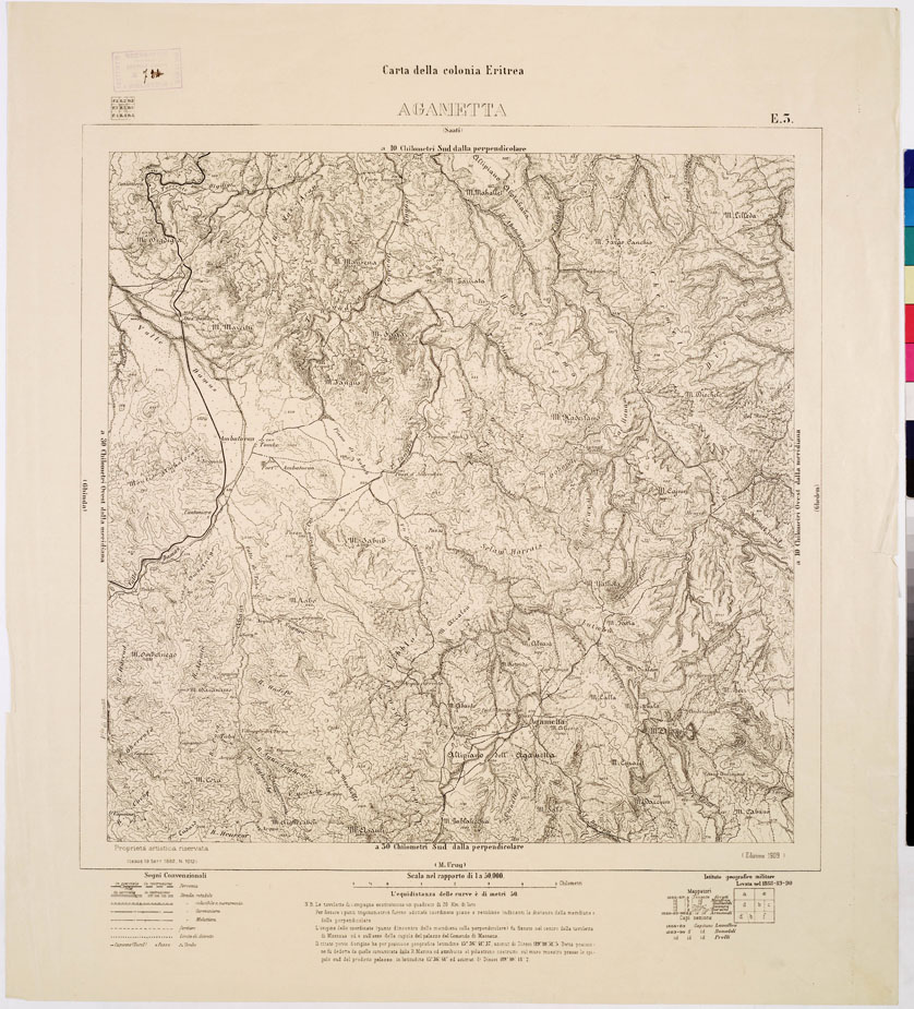 "I.G.M. Riproduzione fotozincografica delle levate originali eseguite alla medesima scala tra gli 1885 e 1891. Questa carta comprende la parte centrale della Colonia tra Zula, Emberèmi, Giangheren e Himberti. La proiezione adottata fu quella del Cassini con centro di sviluppo la Cupola del Palazzo a Massaua la cui posizione geografica era stata determinata astronomicamente fin dal 1885 dalla R. Marina. La carta è in 26 fogli di m. 0,40 di lato, corrispondente quindi a 20 Km. sul terreno. La pubblicazioen fu inziata nel 1890 in edizione policroma (nero per la nomenclatura, le strade, le dune di sabbia azzurro per l'idrografia bistro per il terreno rosso per quote trigonometriche) per i primi fogli e fu poi continuata in nero. In seguito la carta fu stampata interamente in nero. Nel 1909 fu allestita una nuova edizione in nero a curve di livello con equidistanza di 50 m. e numerose quote trigonometrice e topografiche. Fa eccezione il foglio di Sciotel rilevato dal Cap. Severi nel 1894) senza curve con orografia a tratteggio. Nell'ultima edizione figurano in ciascun foglio i nomi dei mappatori e le date delle levate."