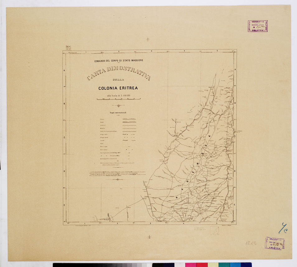 "La carta venne compilata nel 1898-99 in base ai seguenti elementi: rilievi regolari dell'I.G.M. Triangolazione, rilievi speditivi, itinerari e informazioni del Cap. Miani. Carta della spedizione Militare Inglese in Abissinia Itenerari del Cap. Bongiovanni. Nel 1904 venne aggiornata con gli ultimi rilievi regolari dell'I.G.M., con dati della carta del Sudan Egiziano (Intelligence Division War Office) e con itinerari e schizzi dei Tenenti Talamonti, Pisani Capri e Pollera. Questa carta è una riduzione della carta del catalogo ragionato n. ordine 50 inventario n. 694 pagina 533."