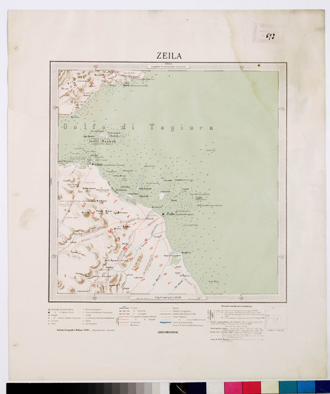 "I.G.M. Carta generale di carattere puramente descrittivo allestita dall'I.G.M. a fine di comprendervi quelle parti di territorio che con i lavori di rilievo regolari, iniziati in Colonia nel 1888, erano rimasti esclusi, e di utilizzare tutti i materiali nuovi che, con le ricognizioni, gli itinerari, gli schizzi, parziali dovuti a ufficiali e funzionari della Colonia, viaggiatori e studiosi, potevano essere ormai impiegati. La pubblicazione della carta fu iniziata nel 1897 e veniva ultimata nel 1902. La carta consta di 30 fogli di 1° di longitudine per 1° di latitudine e comprende il territorio limitato fra il 12° ed il 16° parallelo e fra il 36° meridiano ed il mare. Dei primi fogli fu anche seguita un'edizione al 250.000 in riproduzione degli originali disegnati, ma la pubblicazione non fu poi continuata. Servirono di base per la compilazione della carta le triangolazioni eseguite dall'I.G.M., le determinazioni astronomico-geodetiche dell'Ufficio Idrografico della R. Marina, del geografo D'Abbadie e quelle effettuate durante la spedizione inglese nel 1868. La proiezione impiegata fu la policentrica, sostituita fin dal 1896 a quella del Cassini anteriormente usata per i lavori topografici nella Colonia. Le longitudini furono riferite al meridiano di Greenwich. Per la parte topografica vennero ridotti i rilievi regolari alla scala di 1:50.000 e 1:100.000 dell'I.G.M. oltre le altre fonti sopra menzionate. In relazione alla disponibilità dei documenti utilizzabili, il dettaglio non appare rappresentato con la stessa uniformità nei singoli fogli. Ogni foglio porta nell'angolo inferiore l'indicazione dei documenti sui quali è fondato. La carta è stampata in litografia a colori con orografia a tratteggio in bistro, idrografia in azzurro, rete stradale e itinerari in rosso, vegetazioni in verde, ferrovie e gli altri particolari in nero. Si è impiegata la scrittura in rosso per i nomi delle divisioni politiche e regionali e in nero per i nomi etnografici. I nomi tutti sono scritti con grafia italiana. I fogli furono disegnati alla scala di 1:200.000 e ridotti con la fotozincografia al 400.000. Utilizzando gli elementi della "Carta dimostrativa della Colonia Eritrea" al 500.000 (ved. N° 50 d'ordine, N. 694 d'inventario generale) e altri raccolti per nuove zone della regione, fu allestita una nuova edizione della carta corretta e accresciuta. Essa fu estesa al 18° parallelo per includervi Ras Casar (18° 2') e a sud fino all'11° parallelo per la parte che trovasi ad oriente del 40° meridiano comprendendo così tutta la regione estrema meridionale dell'Aussa e il territorio adiacente alla Baia di Tagiura. La nuova edizione fu pubblicata in 12 fogli interi di 2° di long. per 2° di lat. e due mezzi fogli per la parte meridionale. Fu ultimata nel 1909. Tenuta al corrente per qualche tempo, passò fra le carte di mobilitazione nel 1927."