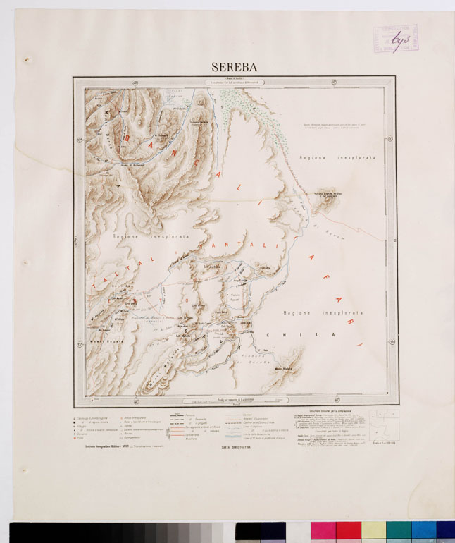 "I.G.M. Carta generale di carattere puramente descrittivo allestita dall'I.G.M. a fine di comprendervi quelle parti di territorio che con i lavori di rilievo regolari, iniziati in Colonia nel 1888, erano rimasti esclusi, e di utilizzare tutti i materiali nuovi che, con le ricognizioni, gli itinerari, gli schizzi, parziali dovuti a ufficiali e funzionari della Colonia, viaggiatori e studiosi, potevano essere ormai impiegati. La pubblicazione della carta fu iniziata nel 1897 e veniva ultimata nel 1902. La carta consta di 30 fogli di 1° di longitudine per 1° di latitudine e comprende il territorio limitato fra il 12° ed il 16° parallelo e fra il 36° meridiano ed il mare. Dei primi fogli fu anche seguita un'edizione al 250.000 in riproduzione degli originali disegnati, ma la pubblicazione non fu poi continuata. Servirono di base per la compilazione della carta le triangolazioni eseguite dall'I.G.M., le determinazioni astronomico-geodetiche dell'Ufficio Idrografico della R. Marina, del geografo D'Abbadie e quelle effettuate durante la spedizione inglese nel 1868. La proiezione impiegata fu la policentrica, sostituita fin dal 1896 a quella del Cassini anteriormente usata per i lavori topografici nella Colonia. Le longitudini furono riferite al meridiano di Greenwich. Per la parte topografica vennero ridotti i rilievi regolari alla scala di 1:50.000 e 1:100.000 dell'I.G.M. oltre le altre fonti sopra menzionate. In relazione alla disponibilità dei documenti utilizzabili, il dettaglio non appare rappresentato con la stessa uniformità nei singoli fogli. Ogni foglio porta nell'angolo inferiore l'indicazione dei documenti sui quali è fondato. La carta è stampata in litografia a colori con orografia a tratteggio in bistro, idrografia in azzurro, rete stradale e itinerari in rosso, vegetazioni in verde, ferrovie e gli altri particolari in nero. Si è impiegata la scrittura in rosso per i nomi delle divisioni politiche e regionali e in nero per i nomi etnografici. I nomi tutti sono scritti con grafia italiana. I fogli furono disegnati alla scala di 1:200.000 e ridotti con la fotozincografia al 400.000. Utilizzando gli elementi della "Carta dimostrativa della Colonia Eritrea" al 500.000 (ved. N° 50 d'ordine, N. 694 d'inventario generale) e altri raccolti per nuove zone della regione, fu allestita una nuova edizione della carta corretta e accresciuta. Essa fu estesa al 18° parallelo per includervi Ras Casar (18° 2') e a sud fino all'11° parallelo per la parte che trovasi ad oriente del 40° meridiano comprendendo così tutta la regione estrema meridionale dell'Aussa e il territorio adiacente alla Baia di Tagiura. La nuova edizione fu pubblicata in 12 fogli interi di 2° di long. per 2° di lat. e due mezzi fogli per la parte meridionale. Fu ultimata nel 1909. Tenuta al corrente per qualche tempo, passò fra le carte di mobilitazione nel 1927."