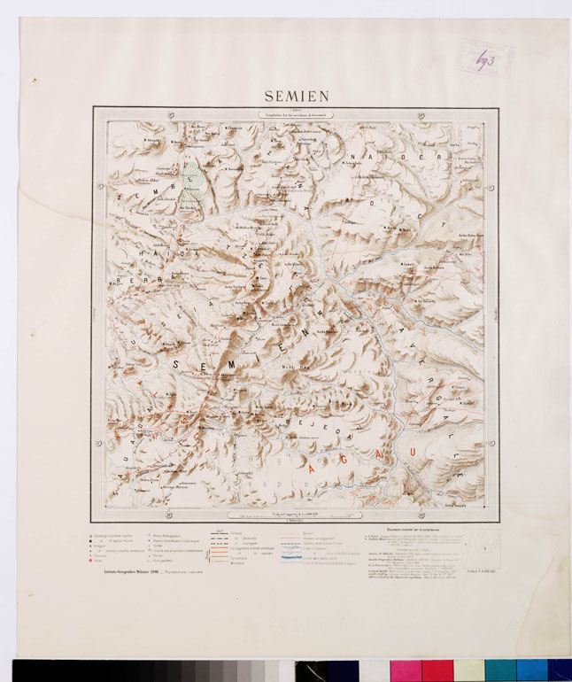"I.G.M. Carta generale di carattere puramente descrittivo allestita dall'I.G.M. a fine di comprendervi quelle parti di territorio che con i lavori di rilievo regolari, iniziati in Colonia nel 1888, erano rimasti esclusi, e di utilizzare tutti i materiali nuovi che, con le ricognizioni, gli itinerari, gli schizzi, parziali dovuti a ufficiali e funzionari della Colonia, viaggiatori e studiosi, potevano essere ormai impiegati. La pubblicazione della carta fu iniziata nel 1897 e veniva ultimata nel 1902. La carta consta di 30 fogli di 1° di longitudine per 1° di latitudine e comprende il territorio limitato fra il 12° ed il 16° parallelo e fra il 36° meridiano ed il mare. Dei primi fogli fu anche seguita un'edizione al 250.000 in riproduzione degli originali disegnati, ma la pubblicazione non fu poi continuata. Servirono di base per la compilazione della carta le triangolazioni eseguite dall'I.G.M., le determinazioni astronomico-geodetiche dell'Ufficio Idrografico della R. Marina, del geografo D'Abbadie e quelle effettuate durante la spedizione inglese nel 1868. La proiezione impiegata fu la policentrica, sostituita fin dal 1896 a quella del Cassini anteriormente usata per i lavori topografici nella Colonia. Le longitudini furono riferite al meridiano di Greenwich. Per la parte topografica vennero ridotti i rilievi regolari alla scala di 1:50.000 e 1:100.000 dell'I.G.M. oltre le altre fonti sopra menzionate. In relazione alla disponibilità dei documenti utilizzabili, il dettaglio non appare rappresentato con la stessa uniformità nei singoli fogli. Ogni foglio porta nell'angolo inferiore l'indicazione dei documenti sui quali è fondato. La carta è stampata in litografia a colori con orografia a tratteggio in bistro, idrografia in azzurro, rete stradale e itinerari in rosso, vegetazioni in verde, ferrovie e gli altri particolari in nero. Si è impiegata la scrittura in rosso per i nomi delle divisioni politiche e regionali e in nero per i nomi etnografici. I nomi tutti sono scritti con grafia italiana. I fogli furono disegnati alla scala di 1:200.000 e ridotti con la fotozincografia al 400.000. Utilizzando gli elementi della "Carta dimostrativa della Colonia Eritrea" al 500.000 (ved. N° 50 d'ordine, N. 694 d'inventario generale) e altri raccolti per nuove zone della regione, fu allestita una nuova edizione della carta corretta e accresciuta. Essa fu estesa al 18° parallelo per includervi Ras Casar (18° 2') e a sud fino all'11° parallelo per la parte che trovasi ad oriente del 40° meridiano comprendendo così tutta la regione estrema meridionale dell'Aussa e il territorio adiacente alla Baia di Tagiura. La nuova edizione fu pubblicata in 12 fogli interi di 2° di long. per 2° di lat. e due mezzi fogli per la parte meridionale. Fu ultimata nel 1909. Tenuta al corrente per qualche tempo, passò fra le carte di mobilitazione nel 1927."