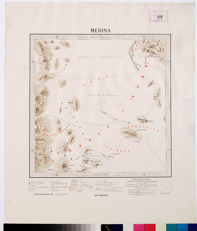 "I.G.M. Carta generale di carattere puramente descrittivo allestita dall'I.G.M. a fine di comprendervi quelle parti di territorio che con i lavori di rilievo regolari, iniziati in Colonia nel 1888, erano rimasti esclusi, e di utilizzare tutti i materiali nuovi che, con le ricognizioni, gli itinerari, gli schizzi, parziali dovuti a ufficiali e funzionari della Colonia, viaggiatori e studiosi, potevano essere ormai impiegati. La pubblicazione della carta fu iniziata nel 1897 e veniva ultimata nel 1902. La carta consta di 30 fogli di 1° di longitudine per 1° di latitudine e comprende il territorio limitato fra il 12° ed il 16° parallelo e fra il 36° meridiano ed il mare. Dei primi fogli fu anche seguita un'edizione al 250.000 in riproduzione degli originali disegnati, ma la pubblicazione non fu poi continuata. Servirono di base per la compilazione della carta le triangolazioni eseguite dall'I.G.M., le determinazioni astronomico-geodetiche dell'Ufficio Idrografico della R. Marina, del geografo D'Abbadie e quelle effettuate durante la spedizione inglese nel 1868. La proiezione impiegata fu la policentrica, sostituita fin dal 1896 a quella del Cassini anteriormente usata per i lavori topografici nella Colonia. Le longitudini furono riferite al meridiano di Greenwich. Per la parte topografica vennero ridotti i rilievi regolari alla scala di 1:50.000 e 1:100.000 dell'I.G.M. oltre le altre fonti sopra menzionate. In relazione alla disponibilità dei documenti utilizzabili, il dettaglio non appare rappresentato con la stessa uniformità nei singoli fogli. Ogni foglio porta nell'angolo inferiore l'indicazione dei documenti sui quali è fondato. La carta è stampata in litografia a colori con orografia a tratteggio in bistro, idrografia in azzurro, rete stradale e itinerari in rosso, vegetazioni in verde, ferrovie e gli altri particolari in nero. Si è impiegata la scrittura in rosso per i nomi delle divisioni politiche e regionali e in nero per i nomi etnografici. I nomi tutti sono scritti con grafia italiana. I fogli furono disegnati alla scala di 1:200.000 e ridotti con la fotozincografia al 400.000. Utilizzando gli elementi della "Carta dimostrativa della Colonia Eritrea" al 500.000 (ved. N° 50 d'ordine, N. 694 d'inventario generale) e altri raccolti per nuove zone della regione, fu allestita una nuova edizione della carta corretta e accresciuta. Essa fu estesa al 18° parallelo per includervi Ras Casar (18° 2') e a sud fino all'11° parallelo per la parte che trovasi ad oriente del 40° meridiano comprendendo così tutta la regione estrema meridionale dell'Aussa e il territorio adiacente alla Baia di Tagiura. La nuova edizione fu pubblicata in 12 fogli interi di 2° di long. per 2° di lat. e due mezzi fogli per la parte meridionale. Fu ultimata nel 1909. Tenuta al corrente per qualche tempo, passò fra le carte di mobilitazione nel 1927."