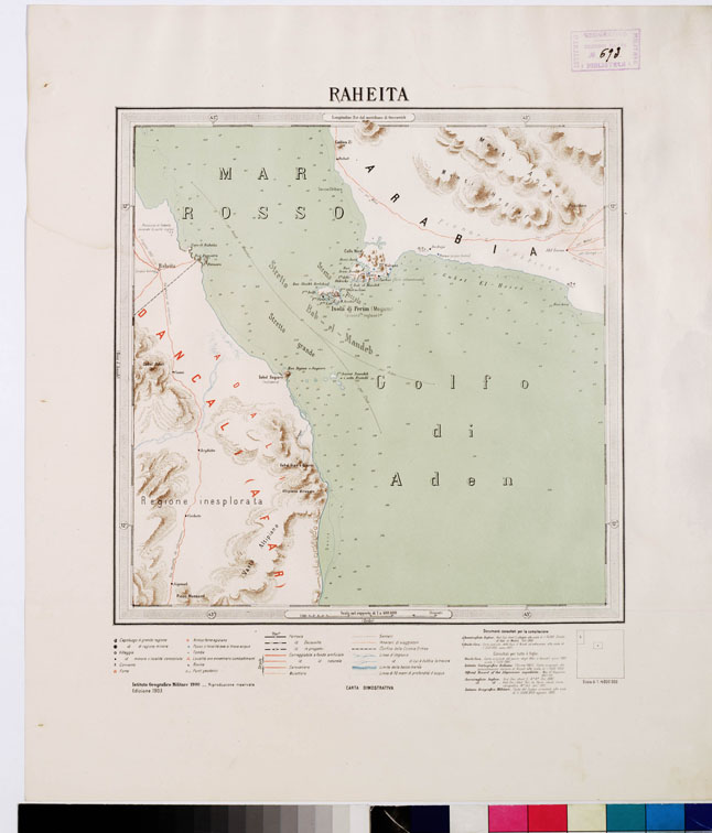 "I.G.M. Carta generale di carattere puramente descrittivo allestita dall'I.G.M. a fine di comprendervi quelle parti di territorio che con i lavori di rilievo regolari, iniziati in Colonia nel 1888, erano rimasti esclusi, e di utilizzare tutti i materiali nuovi che, con le ricognizioni, gli itinerari, gli schizzi, parziali dovuti a ufficiali e funzionari della Colonia, viaggiatori e studiosi, potevano essere ormai impiegati. La pubblicazione della carta fu iniziata nel 1897 e veniva ultimata nel 1902. La carta consta di 30 fogli di 1° di longitudine per 1° di latitudine e comprende il territorio limitato fra il 12° ed il 16° parallelo e fra il 36° meridiano ed il mare. Dei primi fogli fu anche seguita un'edizione al 250.000 in riproduzione degli originali disegnati, ma la pubblicazione non fu poi continuata. Servirono di base per la compilazione della carta le triangolazioni eseguite dall'I.G.M., le determinazioni astronomico-geodetiche dell'Ufficio Idrografico della R. Marina, del geografo D'Abbadie e quelle effettuate durante la spedizione inglese nel 1868. La proiezione impiegata fu la policentrica, sostituita fin dal 1896 a quella del Cassini anteriormente usata per i lavori topografici nella Colonia. Le longitudini furono riferite al meridiano di Greenwich. Per la parte topografica vennero ridotti i rilievi regolari alla scala di 1:50.000 e 1:100.000 dell'I.G.M. oltre le altre fonti sopra menzionate. In relazione alla disponibilità dei documenti utilizzabili, il dettaglio non appare rappresentato con la stessa uniformità nei singoli fogli. Ogni foglio porta nell'angolo inferiore l'indicazione dei documenti sui quali è fondato. La carta è stampata in litografia a colori con orografia a tratteggio in bistro, idrografia in azzurro, rete stradale e itinerari in rosso, vegetazioni in verde, ferrovie e gli altri particolari in nero. Si è impiegata la scrittura in rosso per i nomi delle divisioni politiche e regionali e in nero per i nomi etnografici. I nomi tutti sono scritti con grafia italiana. I fogli furono disegnati alla scala di 1:200.000 e ridotti con la fotozincografia al 400.000. Utilizzando gli elementi della "Carta dimostrativa della Colonia Eritrea" al 500.000 (ved. N° 50 d'ordine, N. 694 d'inventario generale) e altri raccolti per nuove zone della regione, fu allestita una nuova edizione della carta corretta e accresciuta. Essa fu estesa al 18° parallelo per includervi Ras Casar (18° 2') e a sud fino all'11° parallelo per la parte che trovasi ad oriente del 40° meridiano comprendendo così tutta la regione estrema meridionale dell'Aussa e il territorio adiacente alla Baia di Tagiura. La nuova edizione fu pubblicata in 12 fogli interi di 2° di long. per 2° di lat. e due mezzi fogli per la parte meridionale. Fu ultimata nel 1909. Tenuta al corrente per qualche tempo, passò fra le carte di mobilitazione nel 1927."