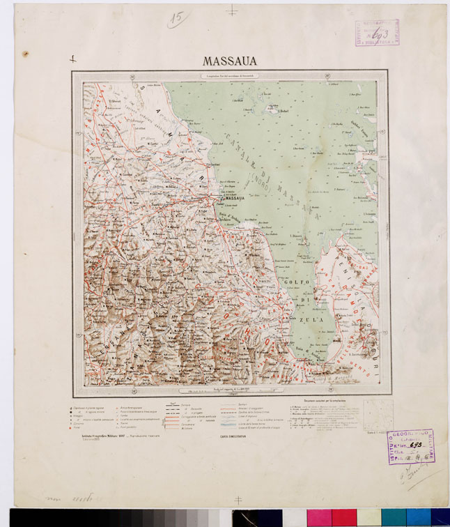 "I.G.M. Carta generale di carattere puramente descrittivo allestita dall'I.G.M. a fine di comprendervi quelle parti di territorio che con i lavori di rilievo regolari, iniziati in Colonia nel 1888, erano rimasti esclusi, e di utilizzare tutti i materiali nuovi che, con le ricognizioni, gli itinerari, gli schizzi, parziali dovuti a ufficiali e funzionari della Colonia, viaggiatori e studiosi, potevano essere ormai impiegati. La pubblicazione della carta fu iniziata nel 1897 e veniva ultimata nel 1902. La carta consta di 30 fogli di 1° di longitudine per 1° di latitudine e comprende il territorio limitato fra il 12° ed il 16° parallelo e fra il 36° meridiano ed il mare. Dei primi fogli fu anche seguita un'edizione al 250.000 in riproduzione degli originali disegnati, ma la pubblicazione non fu poi continuata. Servirono di base per la compilazione della carta le triangolazioni eseguite dall'I.G.M., le determinazioni astronomico-geodetiche dell'Ufficio Idrografico della R. Marina, del geografo D'Abbadie e quelle effettuate durante la spedizione inglese nel 1868. La proiezione impiegata fu la policentrica, sostituita fin dal 1896 a quella del Cassini anteriormente usata per i lavori topografici nella Colonia. Le longitudini furono riferite al meridiano di Greenwich. Per la parte topografica vennero ridotti i rilievi regolari alla scala di 1:50.000 e 1:100.000 dell'I.G.M. oltre le altre fonti sopra menzionate. In relazione alla disponibilità dei documenti utilizzabili, il dettaglio non appare rappresentato con la stessa uniformità nei singoli fogli. Ogni foglio porta nell'angolo inferiore l'indicazione dei documenti sui quali è fondato. La carta è stampata in litografia a colori con orografia a tratteggio in bistro, idrografia in azzurro, rete stradale e itinerari in rosso, vegetazioni in verde, ferrovie e gli altri particolari in nero. Si è impiegata la scrittura in rosso per i nomi delle divisioni politiche e regionali e in nero per i nomi etnografici. I nomi tutti sono scritti con grafia italiana. I fogli furono disegnati alla scala di 1:200.000 e ridotti con la fotozincografia al 400.000. Utilizzando gli elementi della "Carta dimostrativa della Colonia Eritrea" al 500.000 (ved. N° 50 d'ordine, N. 694 d'inventario generale) e altri raccolti per nuove zone della regione, fu allestita una nuova edizione della carta corretta e accresciuta. Essa fu estesa al 18° parallelo per includervi Ras Casar (18° 2') e a sud fino all'11° parallelo per la parte che trovasi ad oriente del 40° meridiano comprendendo così tutta la regione estrema meridionale dell'Aussa e il territorio adiacente alla Baia di Tagiura. La nuova edizione fu pubblicata in 12 fogli interi di 2° di long. per 2° di lat. e due mezzi fogli per la parte meridionale. Fu ultimata nel 1909. Tenuta al corrente per qualche tempo, passò fra le carte di mobilitazione nel 1927."