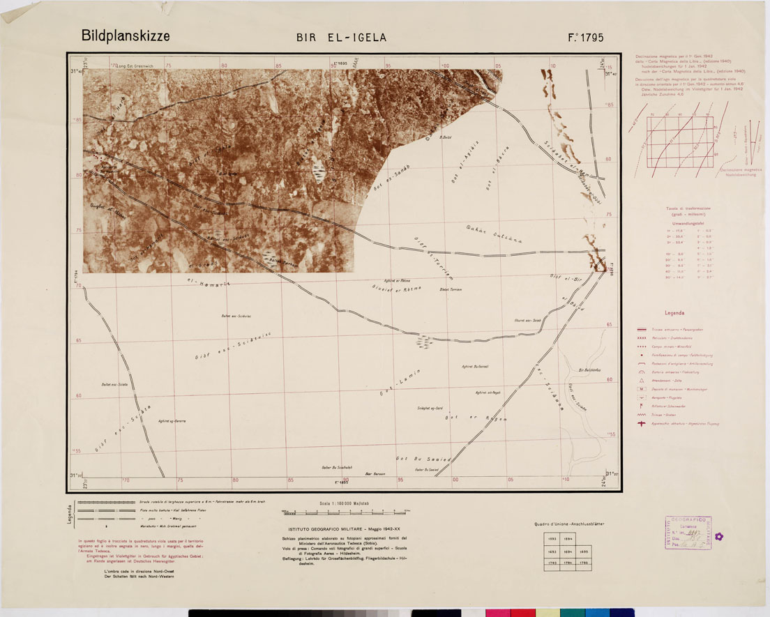 "ISTITUTO GEPOGRAFICO MILITARE. Carta magnetica della Libia. Schizzo planimetrico elaborato su fotopiani approssimati forniti dal Ministero dell'aereonautica tedesca (Sobia). Volo di presa: Comando voli fotografici di grandi superfici Scuola di fotografia aerea - Hildesheim. In questo foglio è traccaita la quadrettatura viola usata per il territorio Egiziano ed è inoltre segnata in nero lungo i margini quella dell'Armata Tedesca. In basso alla carta la legenda dei segni e quadro d'unione."