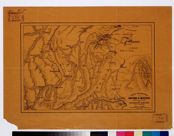"Un foglio riprodotto in litografia in nero su carta pergamenata. Il rilievo orografico è dimostrato a tratteggio. Vi sono segnate alcune quote altimetriche. Il territorio rappresentato si estende fino ad Assus, Asmara, Uahà."
