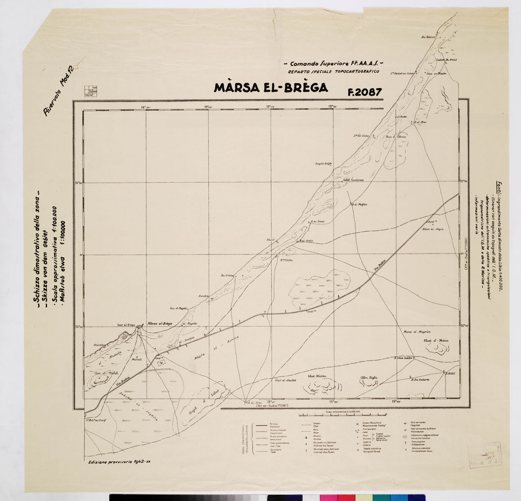 "COMANDO SUPERIORE F.F.A.A. REPARTO SPECIALE TOPOCARTOGRAFICO. Ingrandimento Carta dimostrativa della Libia 1:400.000 rilevamento della costa eseguito dalla R. Marina tracciato della Via Balbia dell'Ufficio Spec.le della Strada. Itinerari vari eseguiti da topografi dell'I.G.M. Determinazioni astronomiche speditive e triangolazioni trigonometriche dell'I.G.M. e della R. Marina. Informazioni varie."