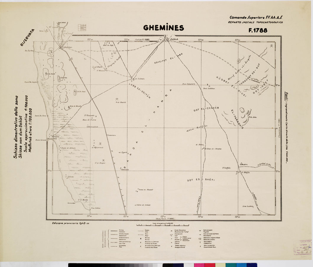 "COMANDO SUPERIORE F.F.A.A. REPARTO SPECIALE TOPOCARTOGRAFICO. Ingrandimento Carta dimostrativa della Libia 1:400.000 rilevamento della costa eseguito della R. Marina tracciato della Via Balbia dell'Ufficio Spec.le della Strada. Itinerari vari eseguiti da topografi dell'I.G.M. determinazioni astronomiche speditive e triangolazioni trigonometriche dell'I.G.M. e delle R. Marina. Informazioni varie."