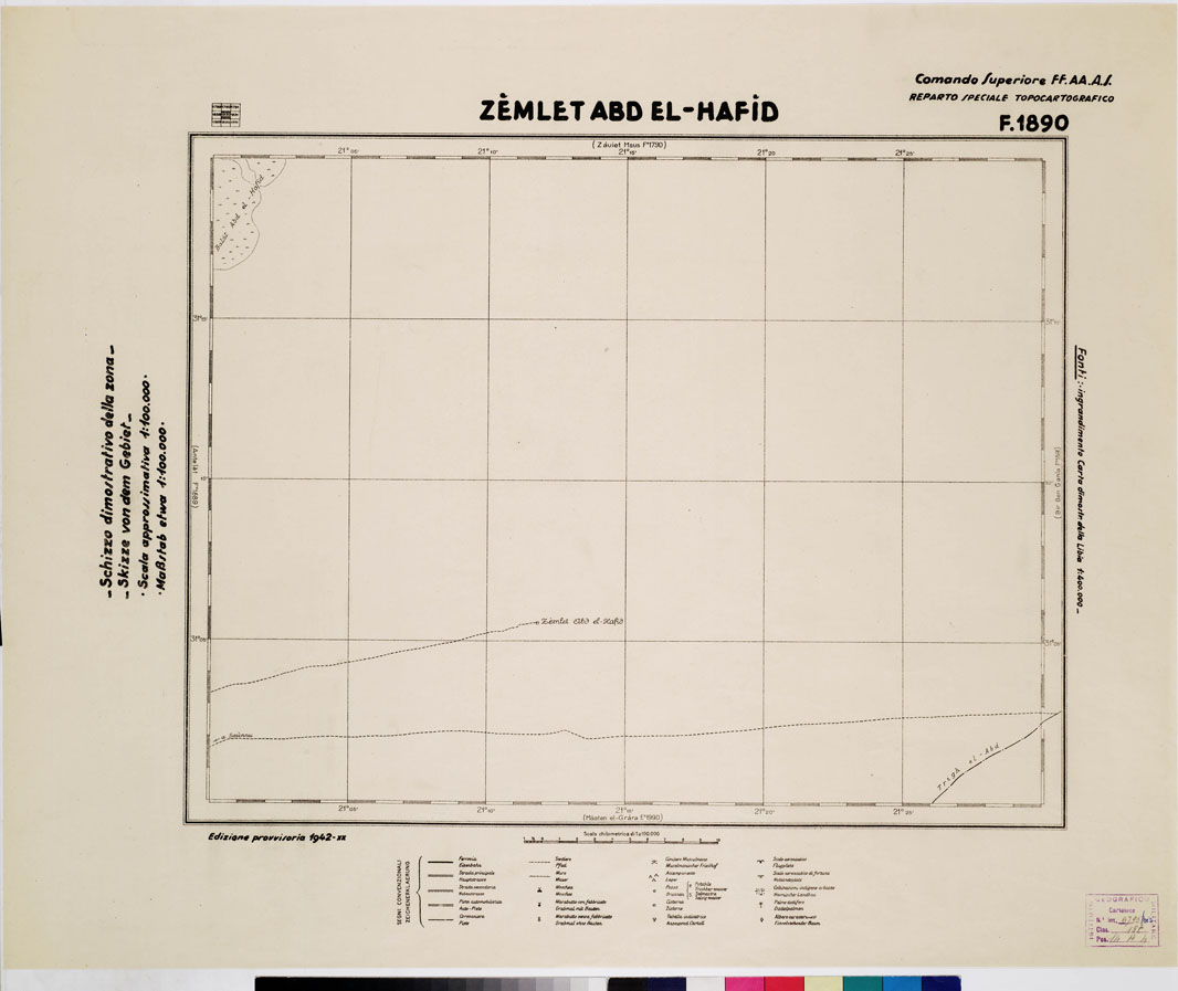 "COMANDO SUPERIORE F.F.A.A. REPARTO SPECIALE TOPOCARTOGRAFICO. Ingrandimento Carta dimostrativa della Libia 1:400.000 rielevamento della costa eseguito dalla R. Marina tracciato della Via Balbia dell'Ufficio Spec.le della Strada. Itinerari vari eseguiti da topografi dell'I.G.M. determinazioni astronomiche speditive e triangolazioni trigonometriche dell'I.G.M. e della R. Marina. Informazioni varie."