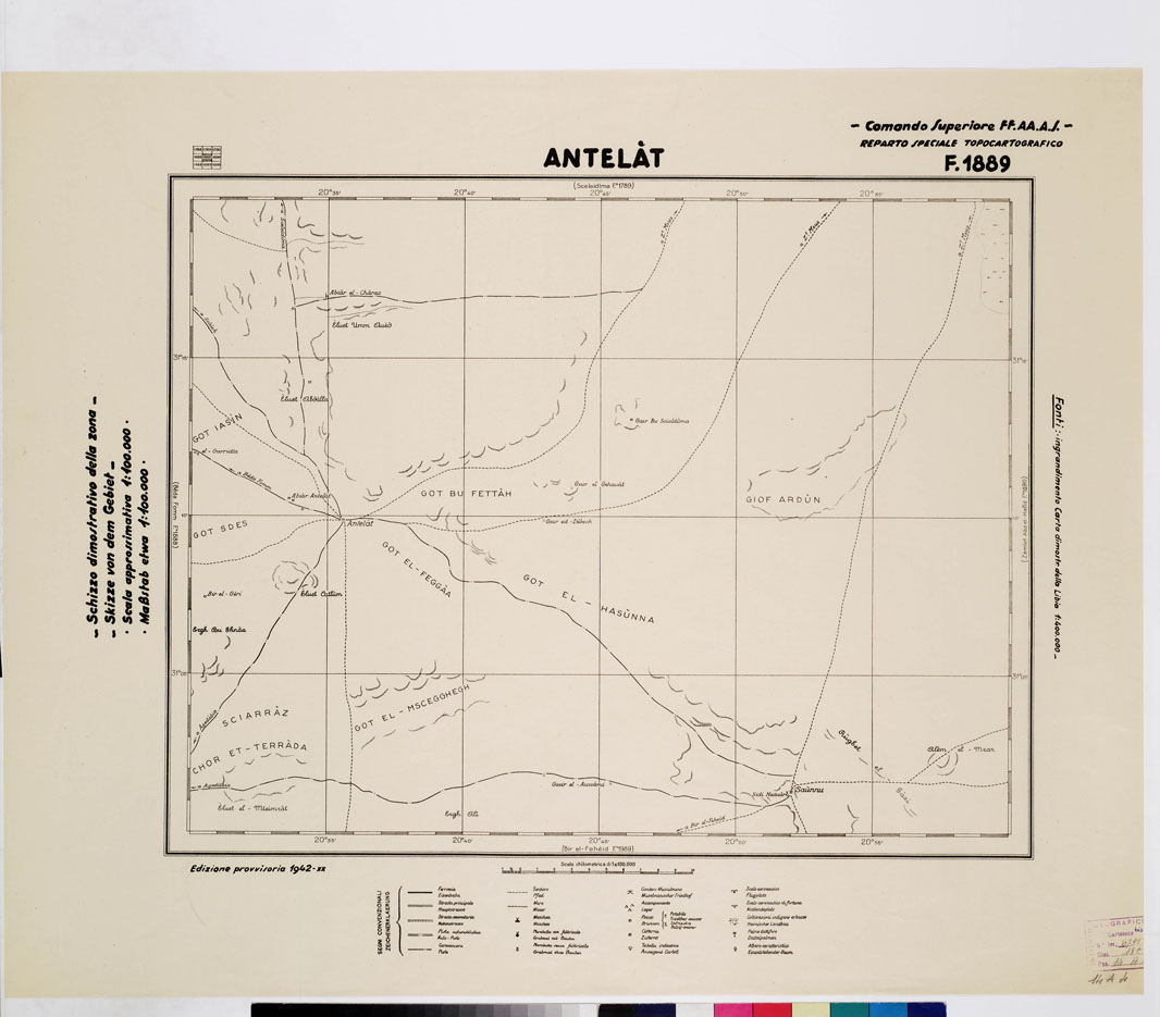 "COMANDO SUPERIORE F.F.A.A. REPARTO SPECIALE TOPOCARTOGRAFICO. Ingrandimento Carta dimostrativa della Libia 1:400.000 rilevamento della costa eseguito dalla R. Marina tracciato della Via Balbia dell'Ufficio Spec.le della Strada. Itinerari vari eseguiti da topografi dell'I.G.M. determinazioni astronomiche speditive e triangolazione trigonometriche dell'I.G.M. e della R.Marina. Informazioni varie."