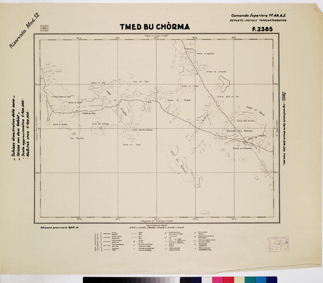 "COMANDO SUPERIORE F.F.A.A. REPARTO SPECIALE TOPOCARTOGRAFICO. Ingrandimento Carta dimostrativa della Libia 1:400.000 rilevamento della costa eseguito dalla R. Marina tracciato della Via Balbia dell'Ufficio Spec.le della Strada. Itinerari vari eseguiti da topografi dell'I.G.M. determinazioni astronomiche speditive e triangolazioni trigonometriche dell'I.G.M. e della R. Marina. Informazioni varie."