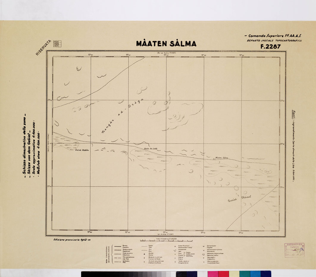 "COMANDO SUPERIORE F.F.A.A. REPARTO SPECIALE TOPOCARTOGRAFICO. Ingrandimento Carta dimostrativa della Libia 1:400.000 rilevamento della costa eseguito dalla R. Marina tracciato della Via Balbia dell'Ufficio Spec.le della Strada. Itinerari vari eseguiti da topografi dell'I.G.M. determinzioni astronomiche speditive e triangolazioni trigonometriche dell'I.G.M. e delle R. Marina. Informazioni varie."