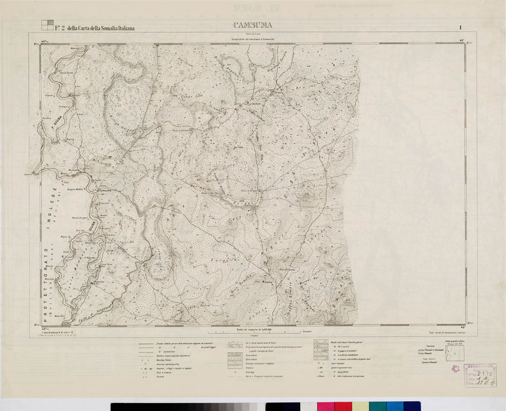 "(Fogli N. 1, 2, 4 della Carta della Somalia Italiana). I.G.M. Questa carta, insieme a quelle della regione di Brava-Soblalle-Avai, al 100 000 (ved. N°11 d'ordine) e della regione dell'Uebi-Scebeli presso Merca, al 1:50000 (v. N°10 d'ordine), rappresenta uno dei rilievi di precisione pubblicati dall'I.G.M. per la Somalia. I lavori topografici regolari furono iniziati nel 1910. Scartata la prima idea di adottare la scala di 1:100000 (perché la carta male avrebbe corrisposto agli scopi per i quali era costruita, volendosi con essa ottenere una guida per le delimitazioni delle concessioni, progetti stradali e di canalizzazione, ecc.), venne scelta la scala di 1:50000 e fu inoltre stabilito di eseguire le livellazioni geometriche. La proiezione impiegata fu la cilindrica equivalente di Lambert. Le levate topografiche, estese in un primo tempo a una superficie di circa 1000 kmq e suddivise in 5 tavolette di 10' di latitudine per 15' di longitudine, denominate rispettivamente Giumbo, Torda, Muriole, Margherita, e Vadda, furono continuate poi nel 1912 e 1913 nella zona settentrionale. Furono comprese così altre 4 tavolette denominate Cainsuma, Gelib sul Giuba, Aughele, Arenaga, sicché l'intera carta copre circa 1900 kmq rappresentati in 9 fogli. La stampa era a colori ma nel 1998 venne restaurata in nero. Le curve altimetriche sono tracciate all'equidistanza di 10 metri. Sono distinte le dune stabili, le dune mobili, le coltivazioni indigene (sciambe), le praterie e i diversi tipi di vegetazione. Per la viabilità si sono impiegati due segni, uno per le carovaniere l'altro per i sentieri. I nomi di luogo sono trascritti secondo la grafia italiana. La carta, pur limitata a una non vasta zona, costituisce un notevole contributo alla cartografia della Somalia."
