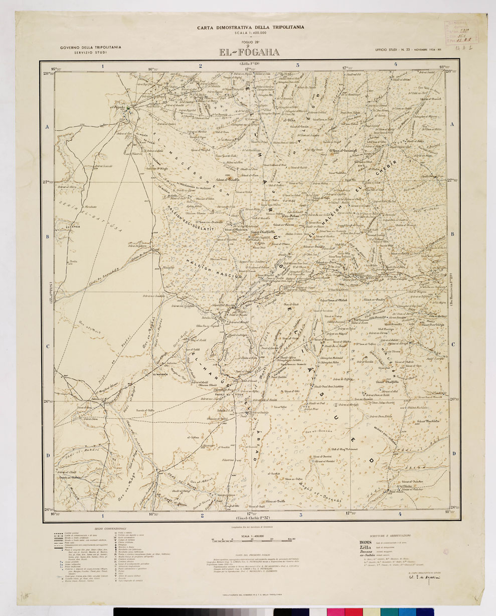 "GOVERNO DELLA TRIPOLITANIA E CIRENAICA. SERVIZIO STUDI. Il piano organico per la cartografia delle Colonie libiche stabilito d'accordo col superiore Ministero delle Colonie, oltre ai rilievi topografici regolari, necessariamente limitati alle zone settentrionali delle due colonie e che sono tuttora in corso, contempla, per i territori dell'interno, una carta all'1:400.000, redatta in base a rilievi speditivi, il cui reparto risulta dal grafico sopra riportato. I fogli di questa carta hanno l'estensione di 2 gradi di meridiano per 2 di parallelo esecuzione, disegno e riproduzione sono affidati al SERVIZIO STUDI, che vi impiega ufficiali topografi dell'I.G.M. I sistemi e procedimenti speciali di tali rilievi consistono in: -Determinazione di caposaldi (coordinate geografiche ottenute mediante osservazioni astronomiche) - Disegno del terreno ottenuto mediante rilevamento di itinerari (poligonali) e di particolari topografici adiacenti agli stessi Ricognizione delle zone interposte - Determinazioni di altitudine con procedimenti barometrici, collegati alle misure di pressione e di temperatura degli osservatori meteorologici del territorio. I 10 fogli compresi in questo primo gruppo, eseguiti nella campagna 1932-33 e contrassegnati in pieno nel grafico di cui sopra, abbracciano una superficie di Kmq. 360.000 circa, inquadrata da oltre 250 determinzioni di coordinate astronomiche e da 19.000 Km. circa di itinerari percorsi e rilevati. L'intera onomastica comprendente circa 2.650 toponomi bilingui accertati, e trascritti in base alle NORME ministeriali, con indicazioni per la loro ricerca nei fogli, e pubblicata in apposito fascicolo. Seguirà prossimamente la pubblicazione del secondo gruppo di 5 fogli per la zona Cufra el-Auenàt, eseguiti nella campagna 1933. Furono infine eseguiti nel 1934, anche al 400.000, rilievi dello stesso carattere nella fascai confinaria sud-occidentale dentale (Tehòmbaca-Gat-In Ezzàn) che verranno prossimamente pubblicati in due fogli speciali. Il Capo del Servizio studi Col. E. De Agostini."