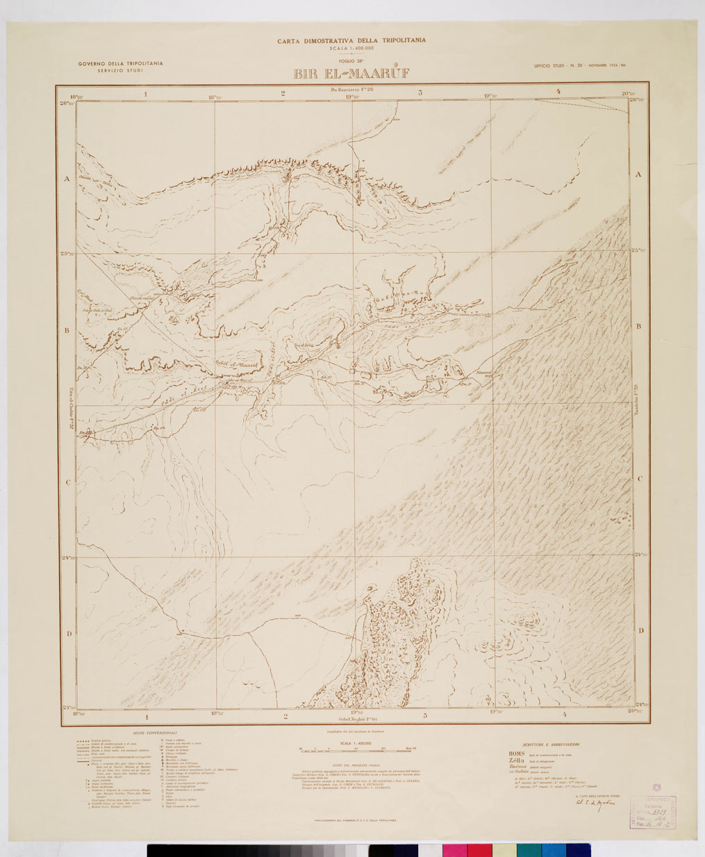 "GOVERNO DELLA TRIPOLITANIA E CIRENAICA. SERVIZIO STUDI. Il piano organico per la cartografia delle Colonie libiche, stabilito d'accordo col superiore Ministero delle Colonie, oltre ai rilievi topografici regolari, necessariamente limitati alle zone settentrionali delle due colonie e che sono tuttora in corso, contempla, per i territori dell'interno, una carta all'1:400.000, redatta in base a rilievi speditivi, il cui reparto risulta dal grafico sopra riportato. I fogli di questa carta hanno l'estensione di 2 gradi di meridiano per 2 di parallelo esecuzione, disegno e riproduzione sono affidati al SERVIZIO STUDI, che vi impiega ufficiali topografi dell'I.G.M. I sistemi e procedimenti speciali di tali rilievi consistono in: - Determinazione di caposaldi (coordinate geografiche ottenute mediante osservazioni astronomiche) - Disegno del terreno ottenuto mediante rilevamento di itinerari (poligonali) e di particolari topografici adiacenti agli itinerari stessi Ricognizione delle zone interposte - Determinazioni di altitudine con procedimenti barometrici, collegati alle misure di pressione e di temperatura degli osservatori meteorologici del territorio. I 10 fogli compresi in questo primo gruppo, eseguiti nella campagna 1932-33 e contrassegnati in pieno nel grafico di cui sopra, abbracciano una superficie di Kmq. 360.000 circa, inquadrata da oltre 250 determinazioni di coordinate astronomiche e da 19.000 Km. circa di itinerari percorsi e rilevati. L'intera onomastica comprendente circa 2.650 toponomi bilingui accertati, e trascritti in base alle NORME ministeriali, con indicazioni per la loro ricerca nei fogli, e pubblicata in apposito fascicolo. Seguirà prossimamente la pubblicazione del secondo gruppo di 5 fogli per la zona Cufra el-Auenàt, eseguiti nella campagna 1933. Furono infine eseguiti nel 1934, anche al 400.000, rilievi dello stesso carattere nella fascia confinaria sud-occidentale dentale (Tehòmbaca-Gat-In Ezzàn) che verranno prossimamente pubblicati in due fogli speciali. Il Capo del Servizio Studi Col. E. De Agostini."