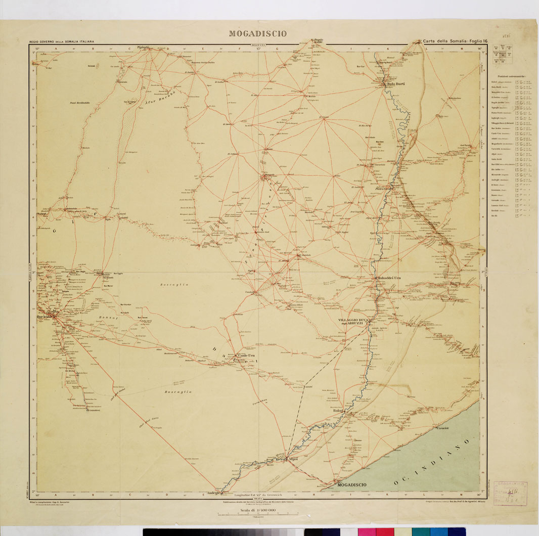 "R. Governo della Somalia Italiana Cap. G. Zaccarini. La carta è pubblicata sotto la direzione del Servizio Cartografico del Ministero delle Colonie (Dirett. A. Dardano). Rilievi e compilazione del Cap. G: Zaccarini disegno, incisione e stampa Soc. An. Prof. G. De Agostini, Milano. Il terreno è rappresentato a fondo unito giallino con orografia a curve dimostrative in bistro, nomi e vegetazioni in nero, acque in azzurro, strade in rosso. L'intera carta si comporrà di 22 fogli. Sono pubblicati i fogli: 1) Bender Cassin 4) Callis 7) Rocca Littorio 11) Belet Uen 12) El Bur 13) Obbia 16) Mogadiscio 17) Itala il foglio N°13 reca il "Piano di Obbia" (scala 1:10.000) il foglio N° 17 "Dintorni di Itala" (scala 1:200.000). L'intera carta si comporrà di 22 fogli. Sono pubblicati i fogli: 1) Bender Cassin 4) Callis 7) Rocca Lettorio 11) Belet Uen 12) El Bur 13) Obbia 16) Mogadiscio 17) Itala il foglio N°13 reca il "Piano di Obbia" (scala 1:10.000) il foglio N°17 "Dintorni di Itala" (scala 1:200.000). Ciascun foglio contiene 2° di longitudine per 2° di latitudine e reca indicate, in tabella apposita, le posizioni astronomiche di varie località. Le longitudini sono calcolate dal Meridiano di Greenwich."