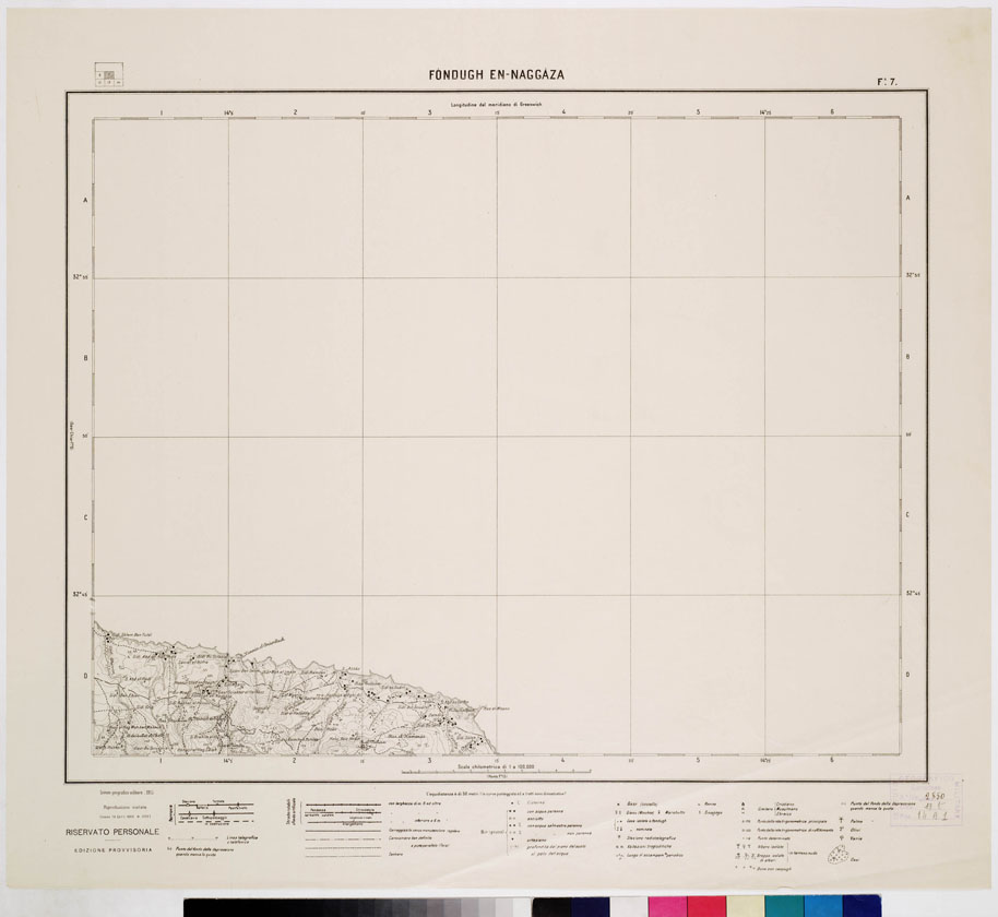 "I.G.M. Edizione provvisoria. La carta si compone di 14 fogli stampati in nero, con orografia dimostrata a mezzo di curve di livello tracciate all'equidistanza di 50 m. sussidiate da curve punteggiate ed a tratti dimostrative. La carta mostra ferrovie (in esercizio e in costruzione), linee telegrafiche e telefoniche, strade, (rotabili a fondo artificiale con larghezza di 6 m. e oltre e con larghezza inferiore a 6 m., carreggiabili senza manutenzione regolare, carovaniere ben definite, carovaniere a piste parallele sentieri), cisterne, pozzi (con acqua perenne, asciutto, con acqua salmastra perenne o non perenne, artesiano), castelli, marabutti, case isolate, rovine, sinagoghe, abitazioni trogloditiche, luoghi di accampamento periodico, cimiteri (cristiani, musulmani, ebraici), stazioni radiotelegrafiche, ecc., e distingue inoltre i vari tipi di vegetazione e i limiti delle oasi. I titoli dei vari fogli sono : 1) Bu Ghemmasc 2) Zelten 3) Zuara 4) Zauia 5) Tripoli 6) Gasc Chiar 7) Fóndugh En-Naggàza 11) Azizia 12) Tarhuna 13) Homs 14) Zliten 15) Misurata 20) Jeffren 21) Garian."