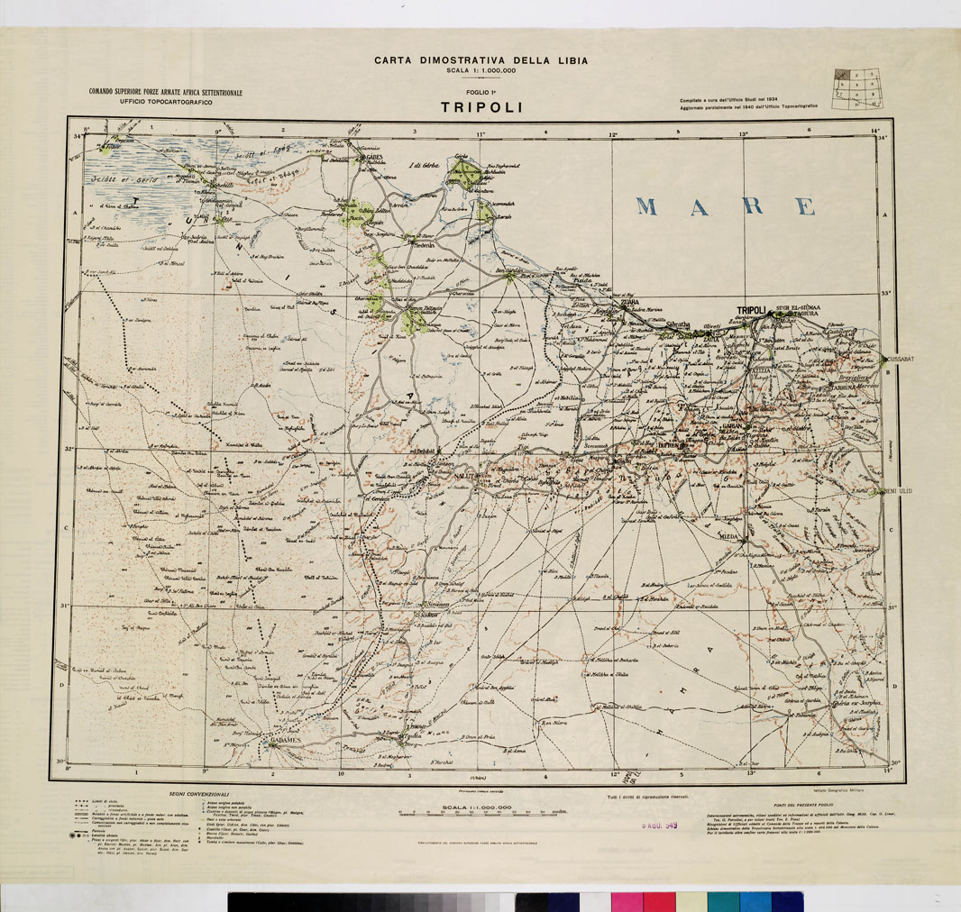 "Comando Superiore Fore Armate Africa Settentrionale - Ufficio Topocartografico. Carta dimostrativa, compilato a cura dell'Ufficio Studi. Aggiornato parzialmente nel 1940 dall' Ufficio Topocartografico. Determinazioni astronomiche, rilievi speditivi ed informazioni di Ufficiali dell' I.G.M. Cap. G. Limer Ten. G. Petrolini e per taluni tratti Ten. E. Pina. Ricognizioni ufficiali addetti al comando delle truppe ed a reparti della Colonia. Schizzo dimostrativo della Tripolitania Settentrionale alla scala di 1:400.000 del Ministero delle Colonie. Per il territorio oltre confine carte francesi alla scala di 1:1.000.000. Tipolitografia dfel Comando Superiore delle Forze Armate."