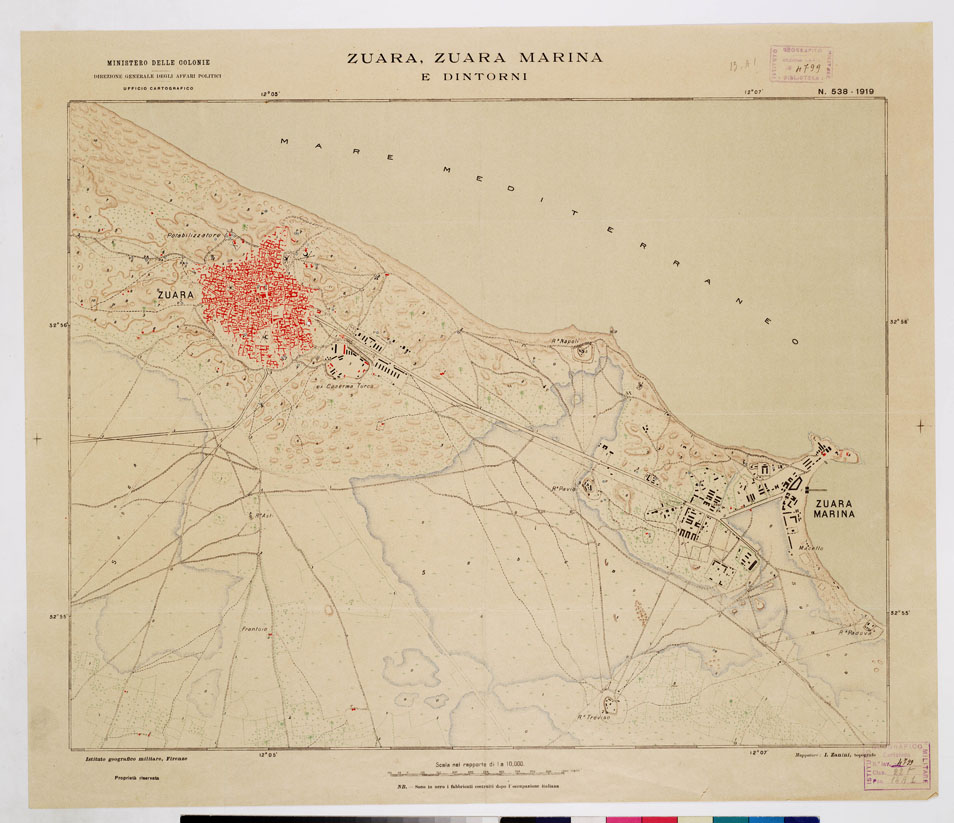 "Ministero delle Colonie - Direzione Generale degli Affari Politici - Ufficio Cartografico. I.G.M. Un foglio a colori. Mappatore I. Zanini, topografo. Dimostrazione orografica in bistro, nomi e strade in nero, acque in azzurro, vegetazioni in verde, costruzioni in rosso. Sono distinti in nero i fabbricati costruiti dopo l'occupazione italiana."