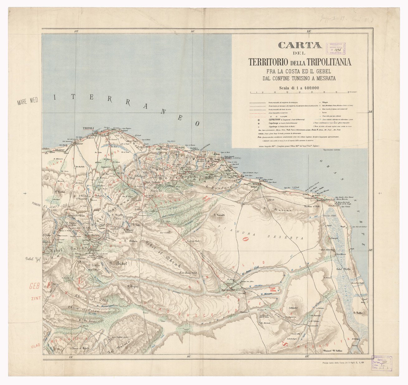 "I.G.M. Una delle carte generali allestite dall'I.G.M. sui migliori documenti utilizzabili all'epoca degli avvenimenti che portarono alla guerra libica. La carta consta di due fogli a colori con rilievo a tratteggio in bistro, idrografia in azzurro, zone coltivate o alberate in verde, rete stradale in nero, quella telegrafica in rosso. I centri abitati sono distinti secondo la loro importanza amministrativa. I nomi di tribù e di vaste regioni sono segnati in rosso. Sulle strade sono indicate le distanze in chilometri (numeri in rosso) e in ore di marcia (numeri in azzurro). Il territorio rappresentato è compreso tra il 10° e il 15° meridiano e da poco oltre il 31° parallelo al Mediterraneo. La carta è peraltro da considerarsi come semplice schizzo logistico di valore largamente approssimativo. Venne compilata dal Top. Principale Juglaris."