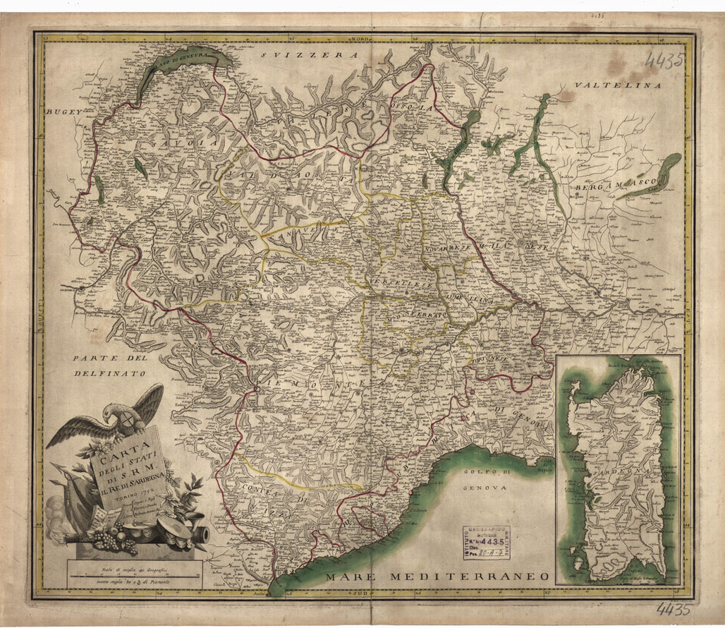 "Sotto il titolo le scale grafiche, nella parte destra in basso un riquadro raffigurante l'Isola della Sardegna. Un foglio tratto da incisione su rame stampato in nero con confini a colori e acque costiere e dei laghi in azzurro. L'orografia è dimostrata schematicamente col tratteggio. Non è tracciata la rete stradale. In basso a destra una cartina supplementare dell'isola di Sardegna. La carta si estende dal lago di Ginevra (nord) al Golfo di Genova (Antibo-Rapallo) (sud) e da Grenoble (ovest) al Lago d'Iseo (est). Due copie una delle quali montata su tela. (B1)"