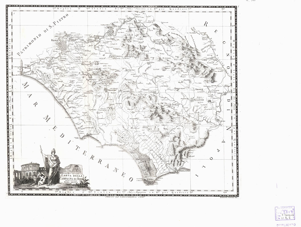 "Duplicato del gruppo di 12 carte pubblicate tra il 1802 e il 1821 alla Calcografia Camerale, Roma, alla scala di 1:246.760. Incisione di Bernardino Olivieri. E' tracciato il reticolato geografico con maglie rispondenti a 10' di latitudine per 10 ' di longitudine. Orografia a monticelli con tratteggio a luce obliqua. Abitati rappresentati in pianta. Sono tracciate le strade e i confini. Stampa in nero. Le 12 carte che compongono questo documento: Carta della Campagna di Roma - - Cfr. duplicato al File B0012955 Carta del Patrimonio di San Pietro - File B0002706 - Cfr. duplicato al File B0012958 Carta della Sabina - File B0002779 - Cfr. duplicatoal File B0012956 Carta del Territorio di Orvieto e Territorio di Perugia - File B0005503 - Cfr. duplicato al File B0012957 Carta della Marca di Fermo - File B0003960 - Cfr. duplicatoal File B0012961 Carta della Provincia dell'Umbria - File B0005509 - Cfr. duplicato al File B0012962 Carta del Ducato di Urbino - File B0005504 - Cfr. duplicato al File B0012959 Carta della Marca di Ancona - File B0003965 - Cfr. duplicato al File B0012960 Legazione di Ravenna divisa ne' suoi Governi - File B0002414 La Legazione di Forlì diviso ne' suoi Governi - File B0002413 Legazione di Bologna divisa ne' suoi Governi - File B0002412 Legazione Apostolica di Ferrara divisa ne' suoi Governi - File B0002411"