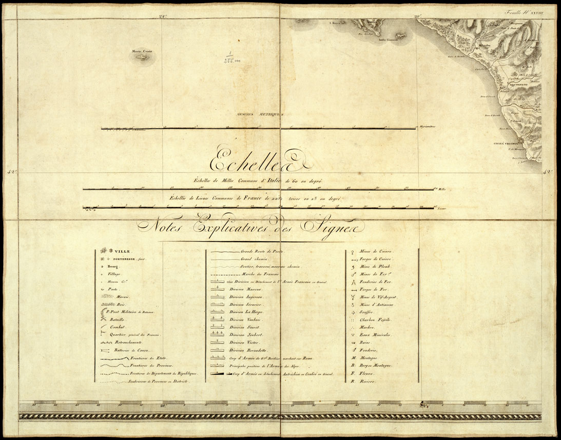 CARTE GENERALE DU THEATRE DE LA GUERRE EN ITALIE ET DANS LES ALPES...(Carta Generale del teatro della guerra in Italia...) - Foglio 28 - Segni Convenzionali - Civitavecchia, Isola di Montecristo