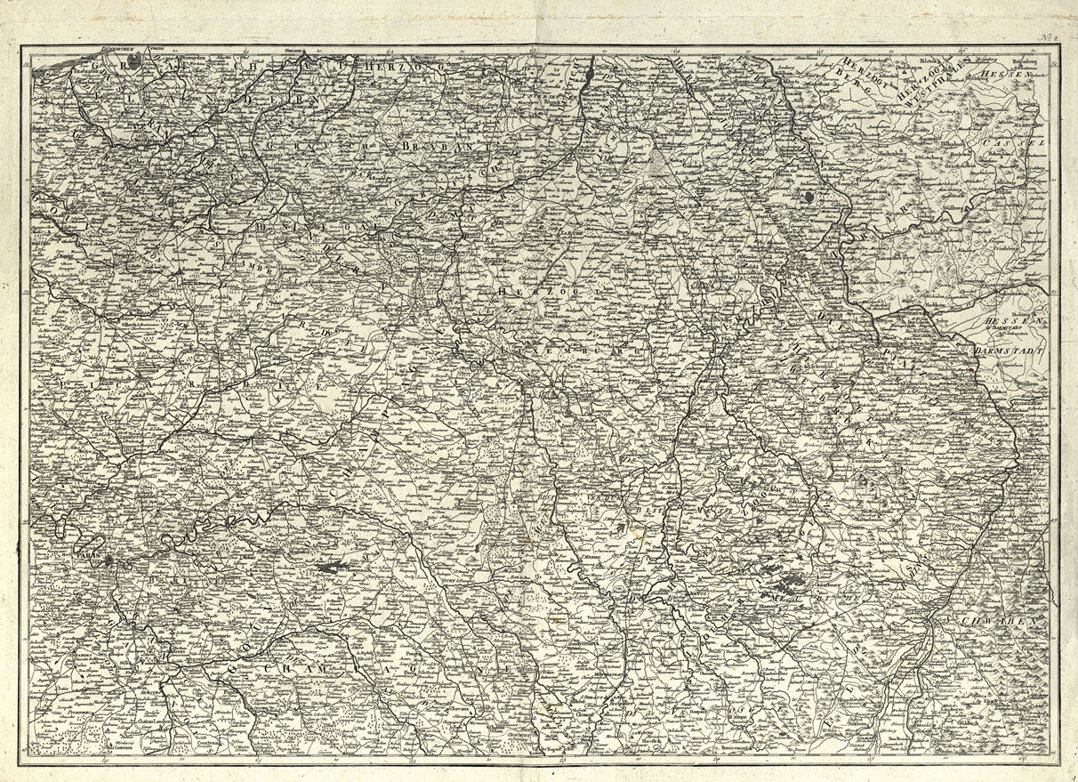 "Nach den Cassinischen Dreyecken und Karten mit der neuen Departements Eintheilung (Nuova Carta Generale della Francia) Wien-bey Artaria und Campanie. La carta è priva di data, da informazioni pervenute da Artaria risulta che è stata pubblicata nell'anno 1807. L'incisione su rame è dovuta ad J.W. Engelmann. Per la compilazione è stata presa per base la carta di Cassini. E' in nero all'infuori dei limiti dipartimentali che sono rappresentati da una linea a piccoli tratti ripassata a mano in color rosso, ed i confini di Stato pure ripassati in rosso od in bleu. E' composta di 6 fogli. Per quanto riguarda l'orografia sono rappresentate solo le catene montuose più importanti mediante i piccoli coni. Le zone boscose sono rappresentate da gruppi di alberelli. Nell'ultimo foglio è indicata la scala in 20 diverse misure antiche. Nei margini è la graduazione le longitudini provengano dall'isola del Ferro."