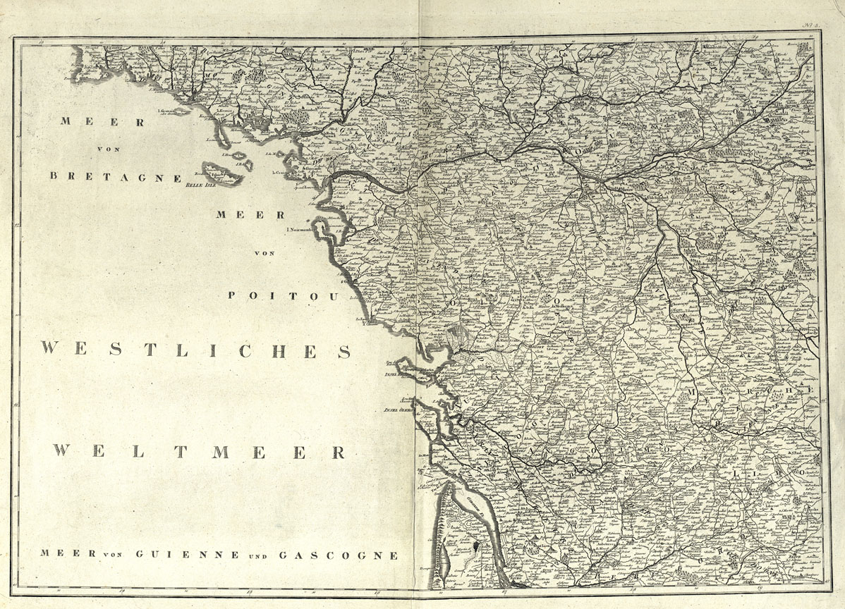 "Nach den Cassinischen Dreyecken und Karten mit der neuen Departements Eintheilung (Nuova Carta Generale della Francia) Wien-bey Artaria und Campanie. La carta è priva di data, da informazioni pervenute da Artaria risulta che è stata pubblicata nell'anno 1807. L'incisione su rame è dovuta ad J.W. Engelmann. Per la compilazione è stata presa per base la carta di Cassini. E' in nero all'infuori dei limiti dipartimentali che sono rappresentati da una linea a piccoli tratti ripassata a mano in color rosso, ed i confini di Stato pure ripassati in rosso od in bleu. E' composta di 6 fogli. Per quanto riguarda l'orografia sono rappresentate solo le catene montuose più importanti mediante i piccoli coni. Le zone boscose sono rappresentate da gruppi di alberelli. Nell'ultimo foglio è indicata la scala in 20 diverse misure antiche. Nei margini è la graduazione le longitudini provengano dall'isola del Ferro."