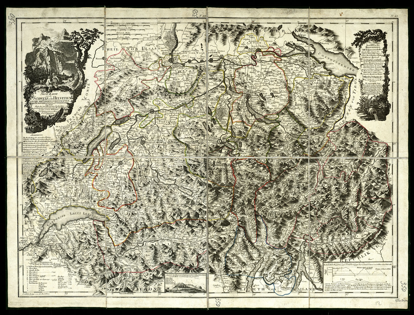 "In die XIII Eidgenossnschaften, ihre Bundsverwandten und Unterthanen eingetheilt. Nach den zuverlassigsten Nachrichten und neuesten astronomischen Beobachtungen, London, 1778 bei W. Faden (Nuova Carta della Svizzera o Helvezia suddivisa in XIII Cantoni con i suoi alleati e sudditi, compilata secondo le notizie esistenti e recenti osservazioni astronomiche, Londra 1778 da W. Faden). Scala grafica in quattro differenti misure antiche corrisponenti al rapporto metrico di 1:421.068 circa. Nuova edizione di F.A. Schraembl, 1789. Si compone di un foglio legato su tela a stacchi, manca l'indicazione delle località dove è stata pubblicata. E' stampata in nero da incisione su rame. I confini amministrativi e politici sono ripassati a mano con varie tinte di acquerello. Le vie di comunicazione principali sono tracciate con due linee parallele e continue, quelle secondarie con una sola linea. L'orografia è rappresentata prospetticamente ed è in posta in buona evidenza. La leggenda situata nell'angolo sud-ovest del foglio contiene alcune altezze espresse in piedi inglesi. Nel margine inferiore della carta è un piccolo panorama della Valle di Chamony, osservato dalla Chiesa omonima nel 1742. Nell'angolo sud-est è disegnato il profilo dei monti che si osservano da Ginevra. La longitudine è indicata a partire dal meridianio dell' isola del ferro. la toponomastca è in lingua tedesca."