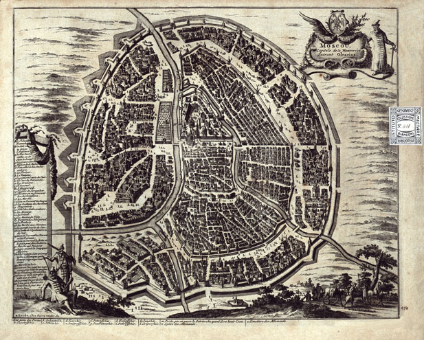 "Suivant Olearius. Pianta prospettica di Mosca, incisa su rame a Leide, chez Pierre Vander Aa."