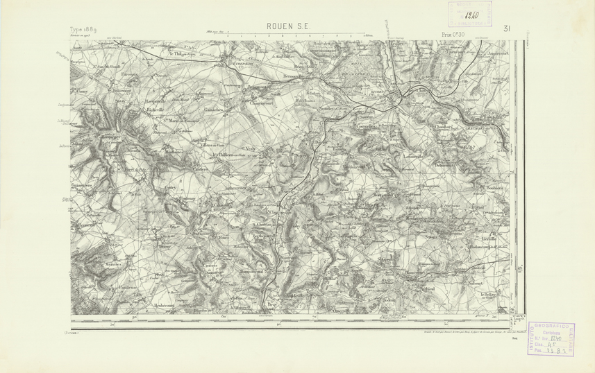 "Paris. Service Géographique de l'Armée, 1889. Ebbe origine dall'Edizione zincografica in quarti di foglio, stabilita dal 1879, per la carta detta de "L'Etat-Major". Infatti non rispondono più il sistema della riproduzione zincografica alle esigenze che la revisione dei fogli imponeva, per un inevitabile logoramento dei rami originali, fu proposta dapprima la correzione degli zinchi, ma questo, importando un lavoro lungo e gravoso, si adottò il procedimento galvanico. I rami galvanici ottenuti e corretti secondo questo sistema presero il nome di "édition type 1889". Allo scopo di facilitare l'incisione fu adoperata la suddivisione in quarti di foglio come per l'edizione zincografica. La revisione dei fogli di questo tipo non fu iniziata che nel 1893. Dal catalogo del S.G.A. risultano mancanti a questa edizione i dipartimenti della "Moselle", del "Bas-Rhin" e del "Haut-Rhin" per i quali non esiste che una edizione in fogli interi aggiornata nel 1901."
