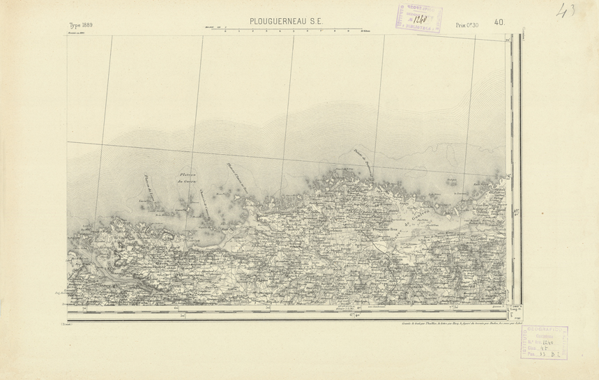 "Paris. Service Géographique de l'Armée, 1889. Ebbe origine dall'Edizione zincografica in quarti di foglio, stabilita dal 1879, per la carta detta de "L'Etat-Major". Infatti non rispondono più il sistema della riproduzione zincografica alle esigenze che la revisione dei fogli imponeva, per un inevitabile logoramento dei rami originali, fu proposta dapprima la correzione degli zinchi, ma questo, importando un lavoro lungo e gravoso, si adottò il procedimento galvanico. I rami galvanici ottenuti e corretti secondo questo sistema presero il nome di "édition type 1889". Allo scopo di facilitare l'incisione fu adoperata la suddivisione in quarti di foglio come per l'edizione zincografica. La revisione dei fogli di questo tipo non fu iniziata che nel 1893. Dal catalogo del S.G.A. risultano mancanti a questa edizione i dipartimenti della "Moselle", del "Bas-Rhin" e del "Haut-Rhin" per i quali non esiste che una edizione in fogli interi aggiornata nel 1901."
