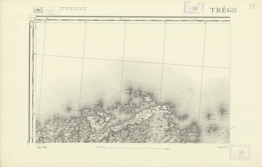 "Paris. Service Géographique de l'Armée, 1889. Ebbe origine dall'Edizione zincografica in quarti di foglio, stabilita dal 1879, per la carta detta de "L'Etat-Major". Infatti non rispondono più il sistema della riproduzione zincografica alle esigenze che la revisione dei fogli imponeva, per un inevitabile logoramento dei rami originali, fu proposta dapprima la correzione degli zinchi, ma questo, importando un lavoro lungo e gravoso, si adottò il procedimento galvanico. I rami galvanici ottenuti e corretti secondo questo sistema presero il nome di "édition type 1889". Allo scopo di facilitare l'incisione fu adoperata la suddivisione in quarti di foglio come per l'edizione zincografica. La revisione dei fogli di questo tipo non fu iniziata che nel 1893. Dal catalogo del S.G.A. risultano mancanti a questa edizione i dipartimenti della "Moselle", del "Bas-Rhin" e del "Haut-Rhin" per i quali non esiste che una edizione in fogli interi aggiornata nel 1901."