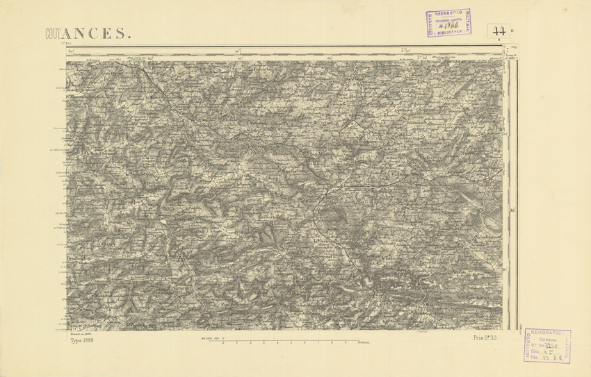 "Paris. Service Géographique de l'Armée, 1889. Ebbe origine dall'Edizione zincografica in quarti di foglio, stabilita dal 1879, per la carta detta de "L'Etat-Major". Infatti non rispondono più il sistema della riproduzione zincografica alle esigenze che la revisione dei fogli imponeva, per un inevitabile logoramento dei rami originali, fu proposta dapprima la correzione degli zinchi, ma questo, importando un lavoro lungo e gravoso, si adottò il procedimento galvanico. I rami galvanici ottenuti e corretti secondo questo sistema presero il nome di "édition type 1889". Allo scopo di facilitare l'incisione fu adoperata la suddivisione in quarti di foglio come per l'edizione zincografica. La revisione dei fogli di questo tipo non fu iniziata che nel 1893. Dal catalogo del S.G.A. risultano mancanti a questa edizione i dipartimenti della "Moselle", del "Bas-Rhin" e del "Haut-Rhin" per i quali non esiste che una edizione in fogli interi aggiornata nel 1901."