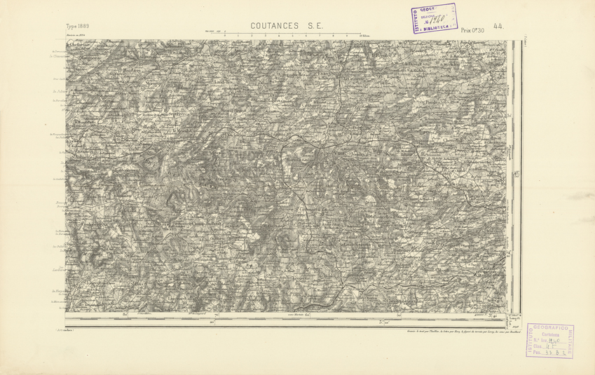 "Paris. Service Géographique de l'Armée, 1889. Ebbe origine dall'Edizione zincografica in quarti di foglio, stabilita dal 1879, per la carta detta de "L'Etat-Major". Infatti non rispondono più il sistema della riproduzione zincografica alle esigenze che la revisione dei fogli imponeva, per un inevitabile logoramento dei rami originali, fu proposta dapprima la correzione degli zinchi, ma questo, importando un lavoro lungo e gravoso, si adottò il procedimento galvanico. I rami galvanici ottenuti e corretti secondo questo sistema presero il nome di "édition type 1889". Allo scopo di facilitare l'incisione fu adoperata la suddivisione in quarti di foglio come per l'edizione zincografica. La revisione dei fogli di questo tipo non fu iniziata che nel 1893. Dal catalogo del S.G.A. risultano mancanti a questa edizione i dipartimenti della "Moselle", del "Bas-Rhin" e del "Haut-Rhin" per i quali non esiste che una edizione in fogli interi aggiornata nel 1901."