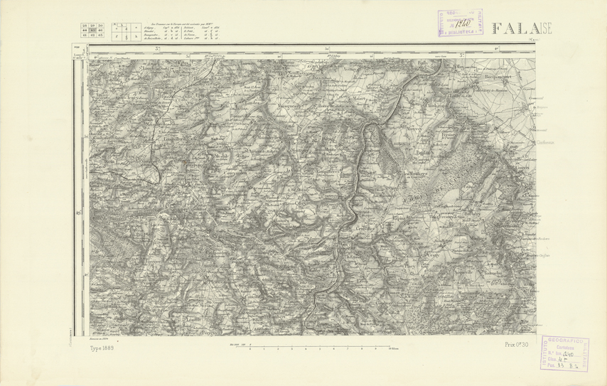 "Paris. Service Géographique de l'Armée, 1889. Ebbe origine dall'Edizione zincografica in quarti di foglio, stabilita dal 1879, per la carta detta de "L'Etat-Major". Infatti non rispondono più il sistema della riproduzione zincografica alle esigenze che la revisione dei fogli imponeva, per un inevitabile logoramento dei rami originali, fu proposta dapprima la correzione degli zinchi, ma questo, importando un lavoro lungo e gravoso, si adottò il procedimento galvanico. I rami galvanici ottenuti e corretti secondo questo sistema presero il nome di "édition type 1889". Allo scopo di facilitare l'incisione fu adoperata la suddivisione in quarti di foglio come per l'edizione zincografica. La revisione dei fogli di questo tipo non fu iniziata che nel 1893. Dal catalogo del S.G.A. risultano mancanti a questa edizione i dipartimenti della "Moselle", del "Bas-Rhin" e del "Haut-Rhin" per i quali non esiste che una edizione in fogli interi aggiornata nel 1901."