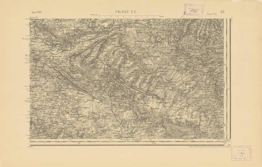 "Paris. Service Géographique de l'Armée, 1889. Ebbe origine dall'Edizione zincografica in quarti di foglio, stabilita dal 1879, per la carta detta de "L'Etat-Major". Infatti non rispondono più il sistema della riproduzione zincografica alle esigenze che la revisione dei fogli imponeva, per un inevitabile logoramento dei rami originali, fu proposta dapprima la correzione degli zinchi, ma questo, importando un lavoro lungo e gravoso, si adottò il procedimento galvanico. I rami galvanici ottenuti e corretti secondo questo sistema presero il nome di "édition type 1889". Allo scopo di facilitare l'incisione fu adoperata la suddivisione in quarti di foglio come per l'edizione zincografica. La revisione dei fogli di questo tipo non fu iniziata che nel 1893. Dal catalogo del S.G.A. risultano mancanti a questa edizione i dipartimenti della "Moselle", del "Bas-Rhin" e del "Haut-Rhin" per i quali non esiste che una edizione in fogli interi aggiornata nel 1901."