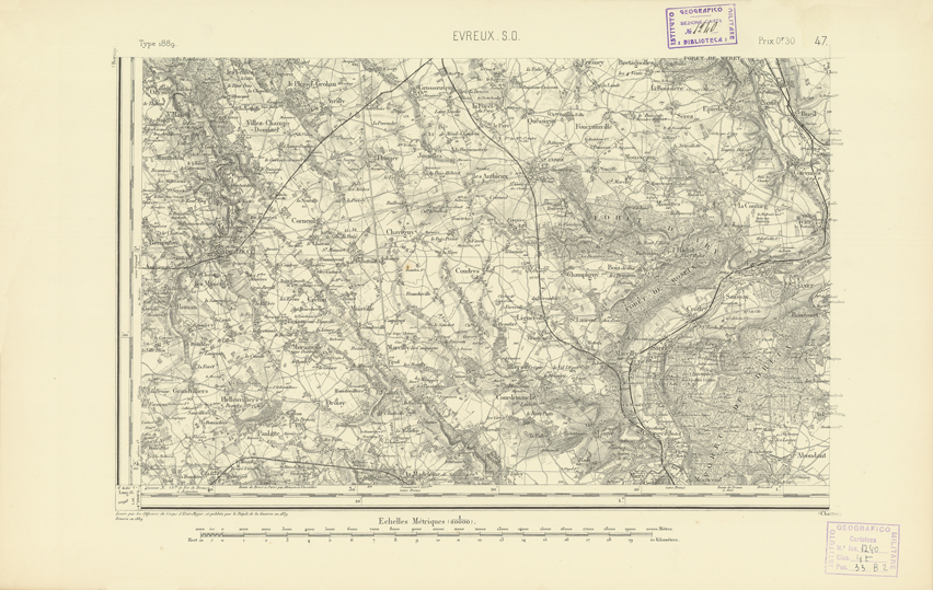 "Paris. Service Géographique de l'Armée, 1889. Ebbe origine dall'Edizione zincografica in quarti di foglio, stabilita dal 1879, per la carta detta de "L'Etat-Major". Infatti non rispondono più il sistema della riproduzione zincografica alle esigenze che la revisione dei fogli imponeva, per un inevitabile logoramento dei rami originali, fu proposta dapprima la correzione degli zinchi, ma questo, importando un lavoro lungo e gravoso, si adottò il procedimento galvanico. I rami galvanici ottenuti e corretti secondo questo sistema presero il nome di "édition type 1889". Allo scopo di facilitare l'incisione fu adoperata la suddivisione in quarti di foglio come per l'edizione zincografica. La revisione dei fogli di questo tipo non fu iniziata che nel 1893. Dal catalogo del S.G.A. risultano mancanti a questa edizione i dipartimenti della "Moselle", del "Bas-Rhin" e del "Haut-Rhin" per i quali non esiste che una edizione in fogli interi aggiornata nel 1901."