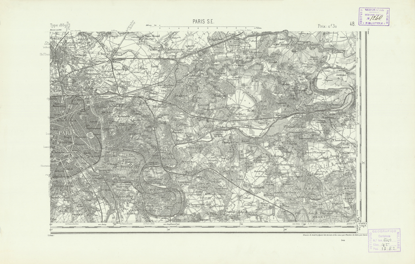 "Paris. Service Géographique de l'Armée, 1889. Ebbe origine dall'Edizione zincografica in quarti di foglio, stabilita dal 1879, per la carta detta de "L'Etat-Major". Infatti non rispondono più il sistema della riproduzione zincografica alle esigenze che la revisione dei fogli imponeva, per un inevitabile logoramento dei rami originali, fu proposta dapprima la correzione degli zinchi, ma questo, importando un lavoro lungo e gravoso, si adottò il procedimento galvanico. I rami galvanici ottenuti e corretti secondo questo sistema presero il nome di "édition type 1889". Allo scopo di facilitare l'incisione fu adoperata la suddivisione in quarti di foglio come per l'edizione zincografica. La revisione dei fogli di questo tipo non fu iniziata che nel 1893. Dal catalogo del S.G.A. risultano mancanti a questa edizione i dipartimenti della "Moselle", del "Bas-Rhin" e del "Haut-Rhin" per i quali non esiste che una edizione in fogli interi aggiornata nel 1901."