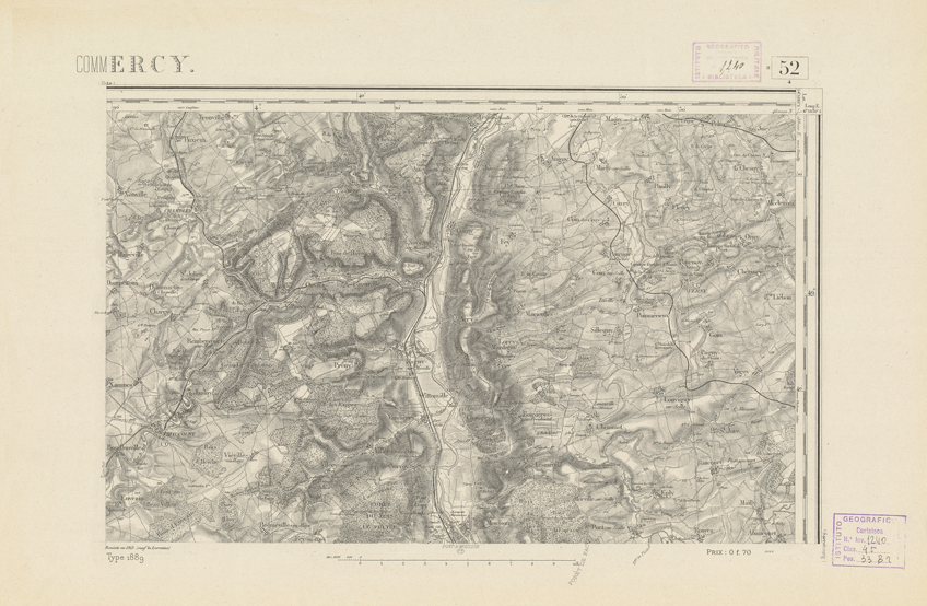 "Paris. Service Géographique de l'Armée, 1889. Ebbe origine dall'Edizione zincografica in quarti di foglio, stabilita dal 1879, per la carta detta de "L'Etat-Major". Infatti non rispondono più il sistema della riproduzione zincografica alle esigenze che la revisione dei fogli imponeva, per un inevitabile logoramento dei rami originali, fu proposta dapprima la correzione degli zinchi, ma questo, importando un lavoro lungo e gravoso, si adottò il procedimento galvanico. I rami galvanici ottenuti e corretti secondo questo sistema presero il nome di "édition type 1889". Allo scopo di facilitare l'incisione fu adoperata la suddivisione in quarti di foglio come per l'edizione zincografica. La revisione dei fogli di questo tipo non fu iniziata che nel 1893. Dal catalogo del S.G.A. risultano mancanti a questa edizione i dipartimenti della "Moselle", del "Bas-Rhin" e del "Haut-Rhin" per i quali non esiste che una edizione in fogli interi aggiornata nel 1901."