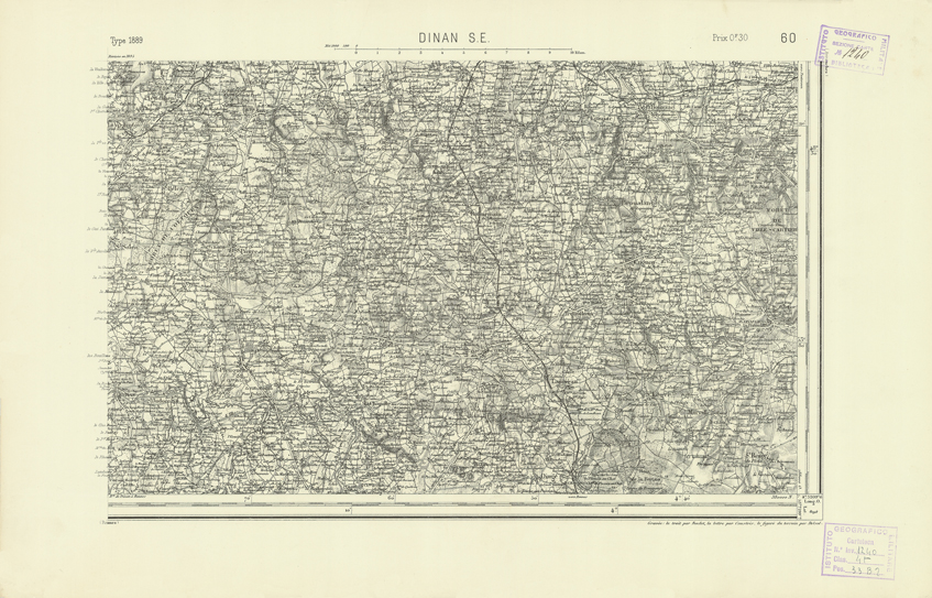 "Paris. Service Géographique de l'Armée, 1889. Ebbe origine dall'Edizione zincografica in quarti di foglio, stabilita dal 1879, per la carta detta de "L'Etat-Major". Infatti non rispondono più il sistema della riproduzione zincografica alle esigenze che la revisione dei fogli imponeva, per un inevitabile logoramento dei rami originali, fu proposta dapprima la correzione degli zinchi, ma questo, importando un lavoro lungo e gravoso, si adottò il procedimento galvanico. I rami galvanici ottenuti e corretti secondo questo sistema presero il nome di "édition type 1889". Allo scopo di facilitare l'incisione fu adoperata la suddivisione in quarti di foglio come per l'edizione zincografica. La revisione dei fogli di questo tipo non fu iniziata che nel 1893. Dal catalogo del S.G.A. risultano mancanti a questa edizione i dipartimenti della "Moselle", del "Bas-Rhin" e del "Haut-Rhin" per i quali non esiste che una edizione in fogli interi aggiornata nel 1901."
