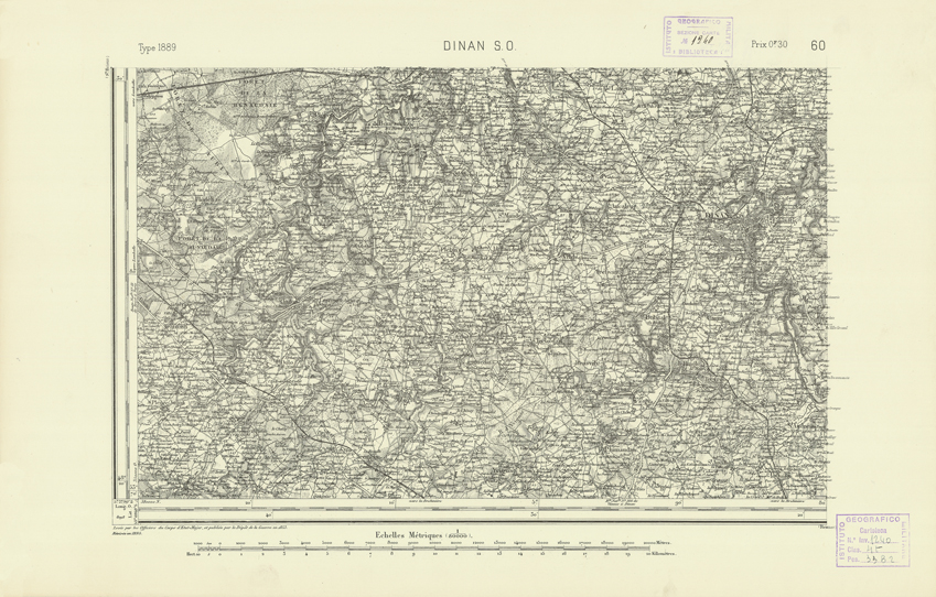 "Paris. Service Géographique de l'Armée, 1889. Ebbe origine dall'Edizione zincografica in quarti di foglio, stabilita dal 1879, per la carta detta de "L'Etat-Major". Infatti non rispondono più il sistema della riproduzione zincografica alle esigenze che la revisione dei fogli imponeva, per un inevitabile logoramento dei rami originali, fu proposta dapprima la correzione degli zinchi, ma questo, importando un lavoro lungo e gravoso, si adottò il procedimento galvanico. I rami galvanici ottenuti e corretti secondo questo sistema presero il nome di "édition type 1889". Allo scopo di facilitare l'incisione fu adoperata la suddivisione in quarti di foglio come per l'edizione zincografica. La revisione dei fogli di questo tipo non fu iniziata che nel 1893. Dal catalogo del S.G.A. risultano mancanti a questa edizione i dipartimenti della "Moselle", del "Bas-Rhin" e del "Haut-Rhin" per i quali non esiste che una edizione in fogli interi aggiornata nel 1901."
