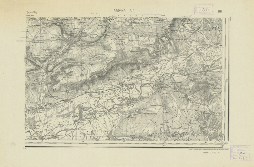 "Paris. Service Géographique de l'Armée, 1889. Ebbe origine dall'Edizione zincografica in quarti di foglio, stabilita dal 1879, per la carta detta de "L'Etat-Major". Infatti non rispondono più il sistema della riproduzione zincografica alle esigenze che la revisione dei fogli imponeva, per un inevitabile logoramento dei rami originali, fu proposta dapprima la correzione degli zinchi, ma questo, importando un lavoro lungo e gravoso, si adottò il procedimento galvanico. I rami galvanici ottenuti e corretti secondo questo sistema presero il nome di "édition type 1889". Allo scopo di facilitare l'incisione fu adoperata la suddivisione in quarti di foglio come per l'edizione zincografica. La revisione dei fogli di questo tipo non fu iniziata che nel 1893. Dal catalogo del S.G.A. risultano mancanti a questa edizione i dipartimenti della "Moselle", del "Bas-Rhin" e del "Haut-Rhin" per i quali non esiste che una edizione in fogli interi aggiornata nel 1901."